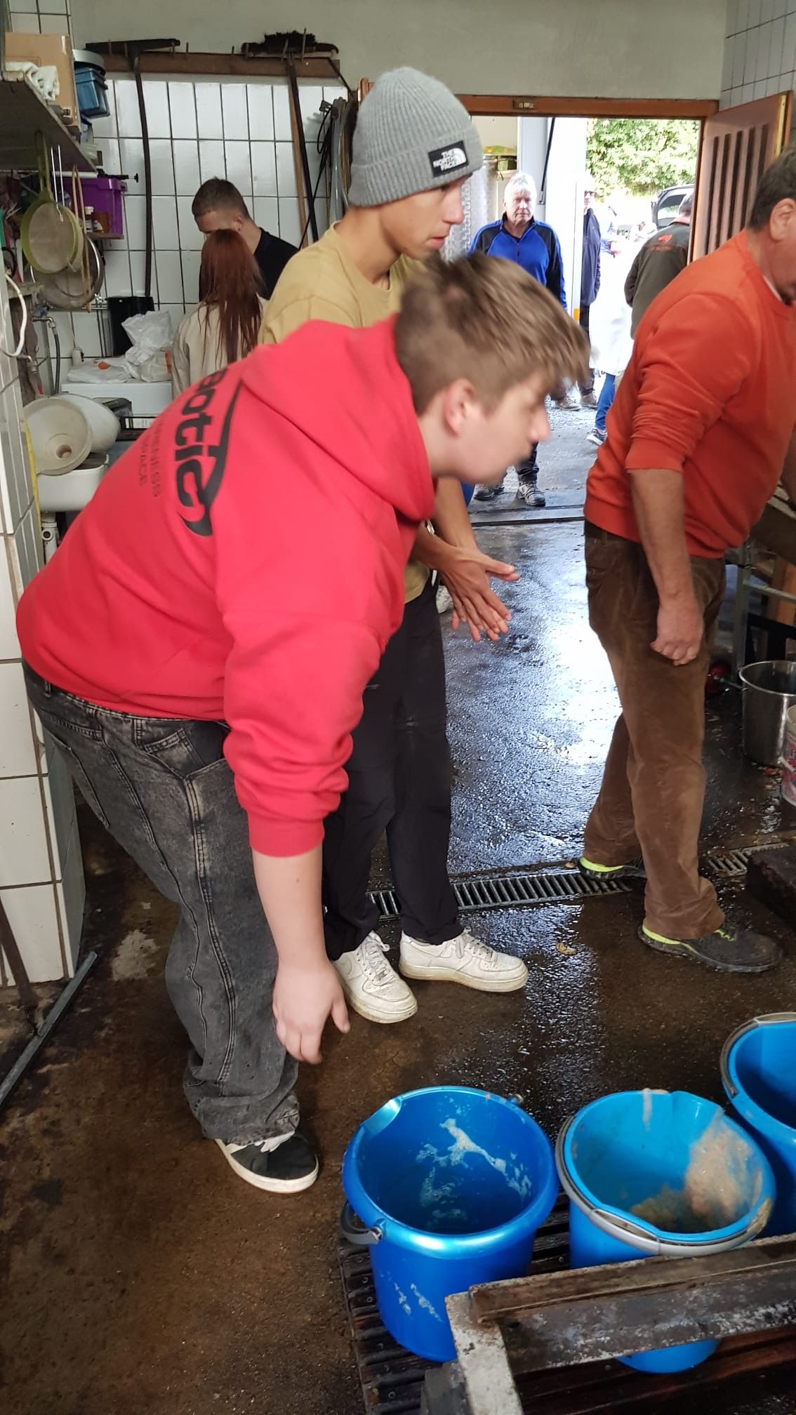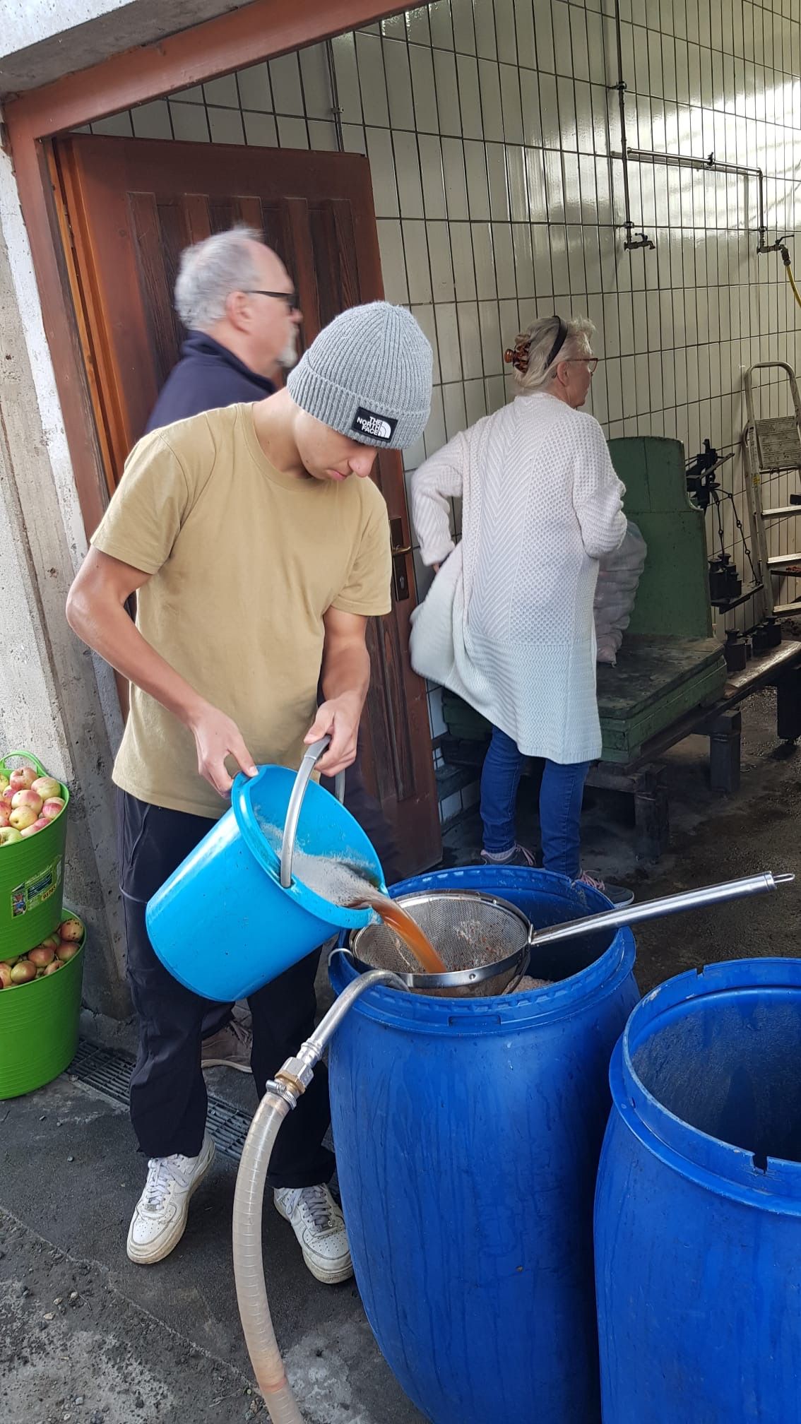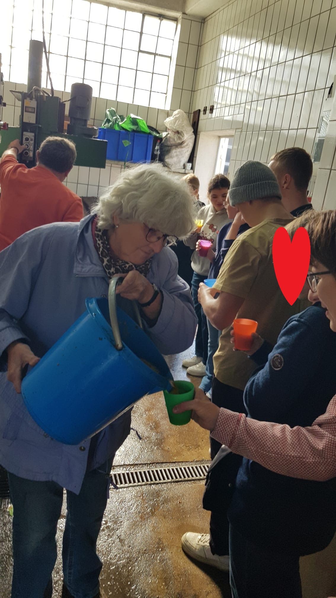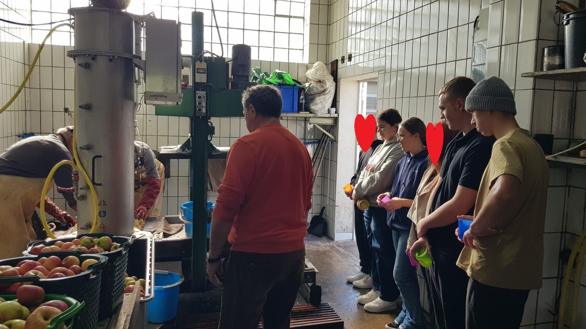 Einen Tag später machten wir, die Klasse L8, uns mit den gefüllten Säcken auf den Weg nach Burgkunstadt zur mobilen Apfelpresse. Wir entluden die Säcke aus dem Bus, diese wurden gewogen und danach schütteten die Männer der mobilen Apfelpresse die Äpfel in den Auffangbehälter der Presse. Die Äpfel wurden in der Presse zerschrettert und der frisch gepresste Apfelsaft floss in einen Eimer. Da sich noch kleine Stücke in dem Saft befanden, musste der Apfelsaft nochmals gesiebt werden. Damit sich der Saft länger hält wurde dieser anschließend erhitzt. Wir durften später alle von dem köstlichen Apfelsaft probieren. Er schmeckte sehr lecker. Wir fanden den Ausflug zur mobilen Apfelpresse sehr aufregend und interessant. Sie können den leckeren Saft bei dem wunderschönen Herbstmarkt in Lichtenfels, der am 11.10.2025 stattfindet und an dem unsere Schule einen Stand hat, erwerben.
