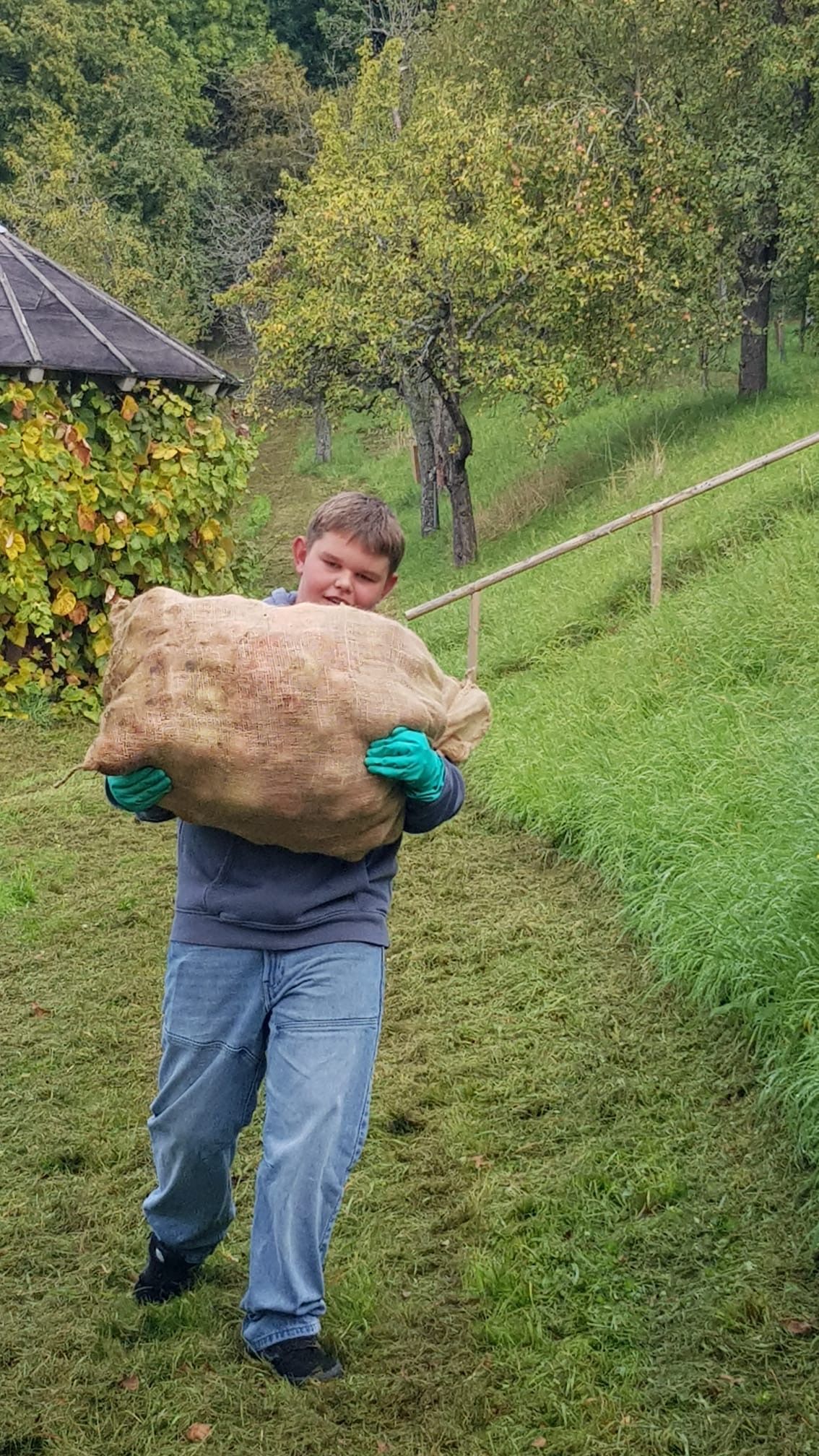 Immer zwei Schüler von uns arbeiteten auf der Streuobstwiese zusammen. Wir bekamen von Frau Vonbrunn Jutesäcke und füllten diese fleißig mit den gepflückten Äpfeln. Nachdem wir fertig waren, banden wir die prall gefüllten Säcke mit einer Schnur zu. Unser netter Hausmeister Herr Göhring, der uns bereits nach Klosterbanz gefahren hat, holte uns auch wieder ab. Wir fanden den Tag richtig cool – der etwas andere Schultag hat uns viel Spaß bereitet.