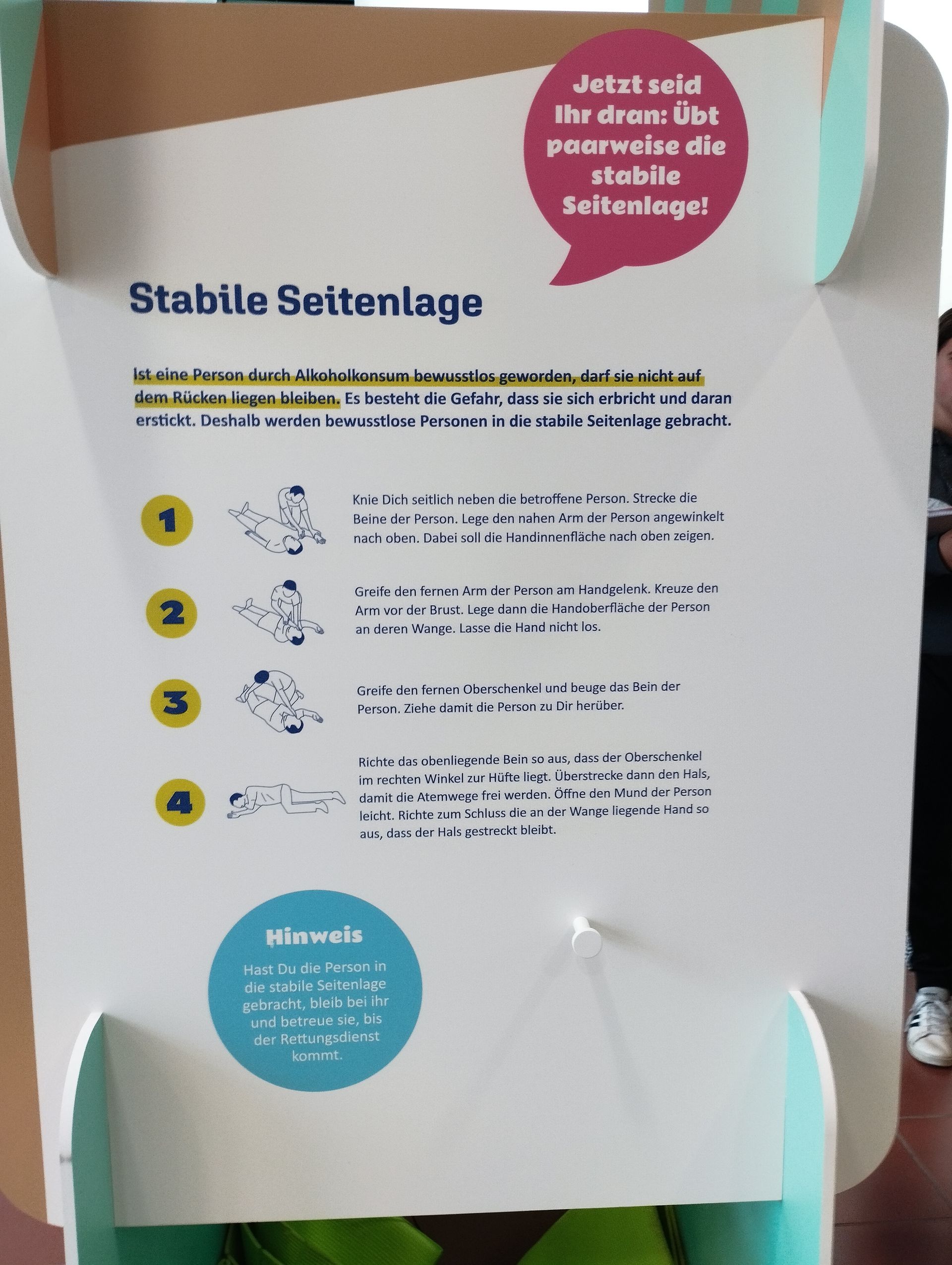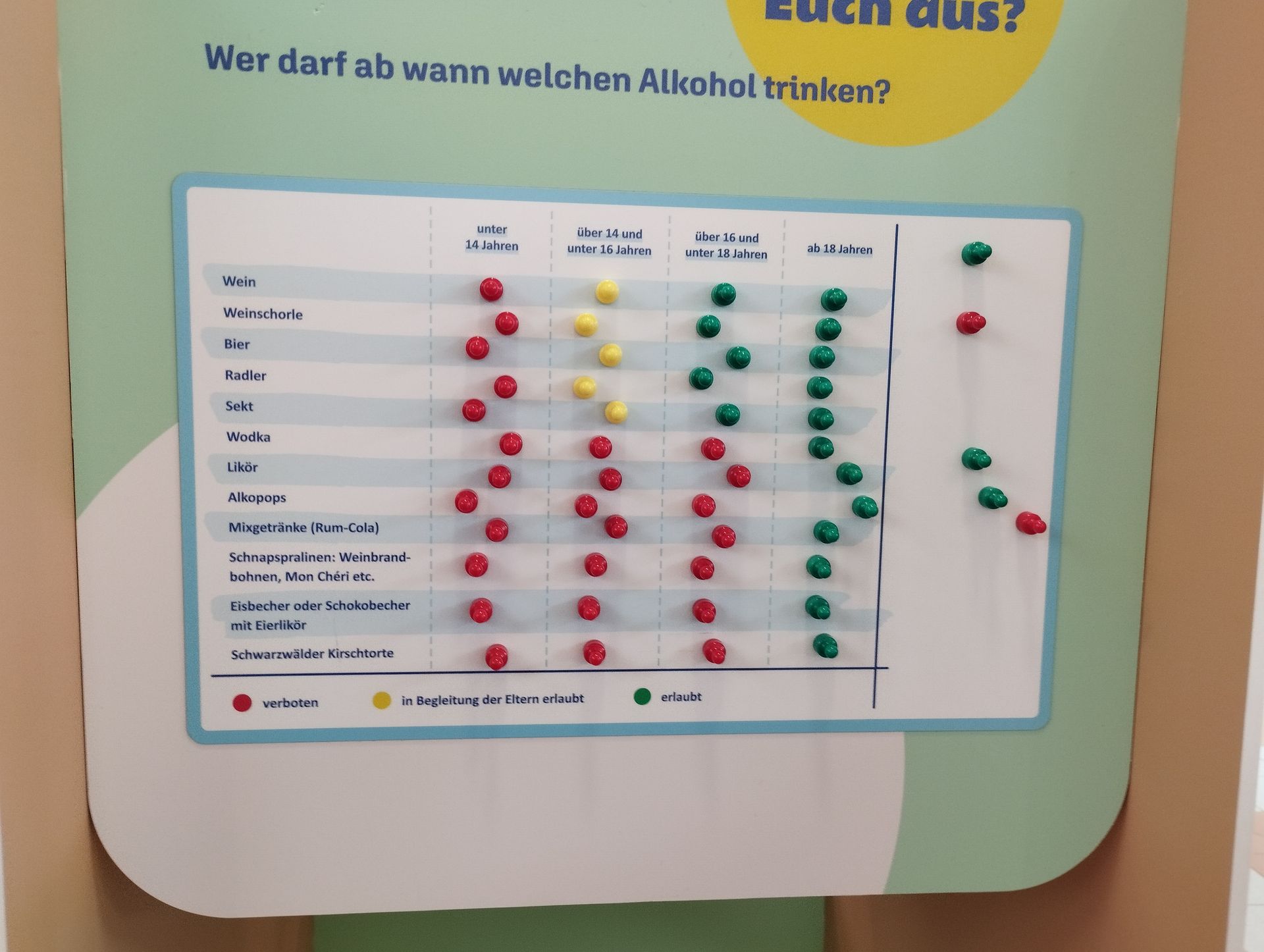 Unsere Klasse wurde in zwei Gruppen aufgeteilt. Zusammen mit je einer Referentin durchliefen wir die acht Stationen zu verschiedenen Themen, z.B. was passiert mit dem Körper, wenn man Alkohol trinkt, was darf man in welchem Alter…