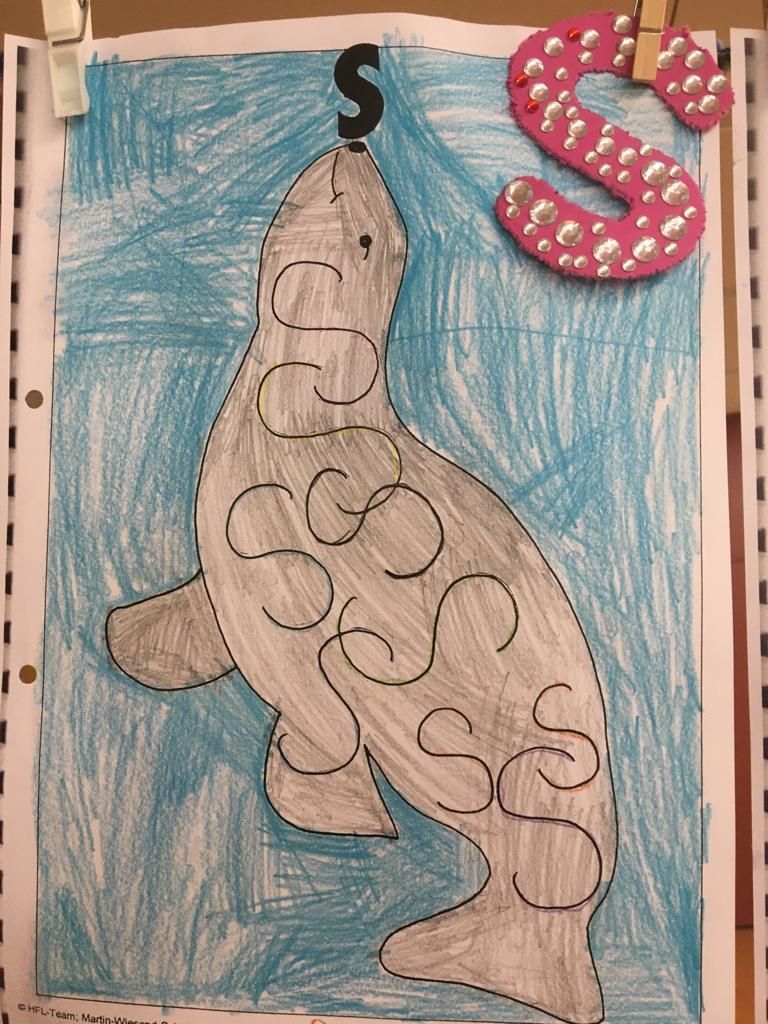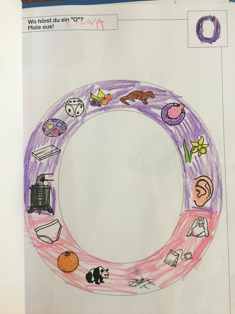 Dann wird geschnitten, geprickelt, gestempelt, getupft, verziert, gepuzzelt und ausgemalt. Es geht nicht darum den Schreibablauf zu erlernen, sondern sich spielerisch und ganzheitlich mit den Buchstabenlauten und den dazugehörigen Hand-Mund-Bildern auseinanderzusetzen, sie herauszuhören und zuzuordnen. Im Morgenkreis gibt es dazu gerne den passenden Imbiss, z.B. Apfelschnitze zum A, Melone zum M oder Orangensaft zum O.