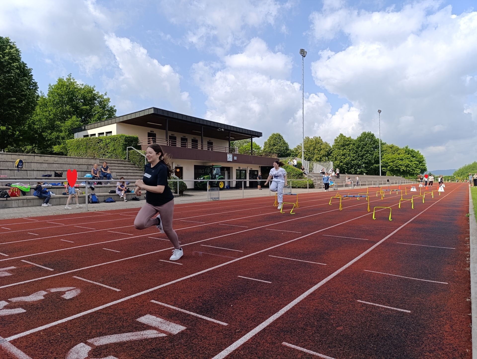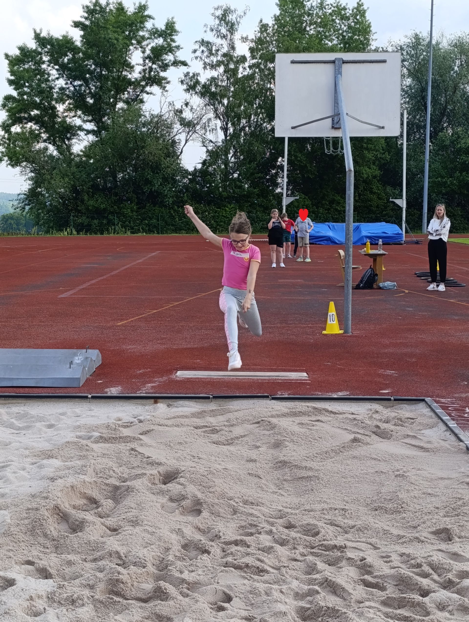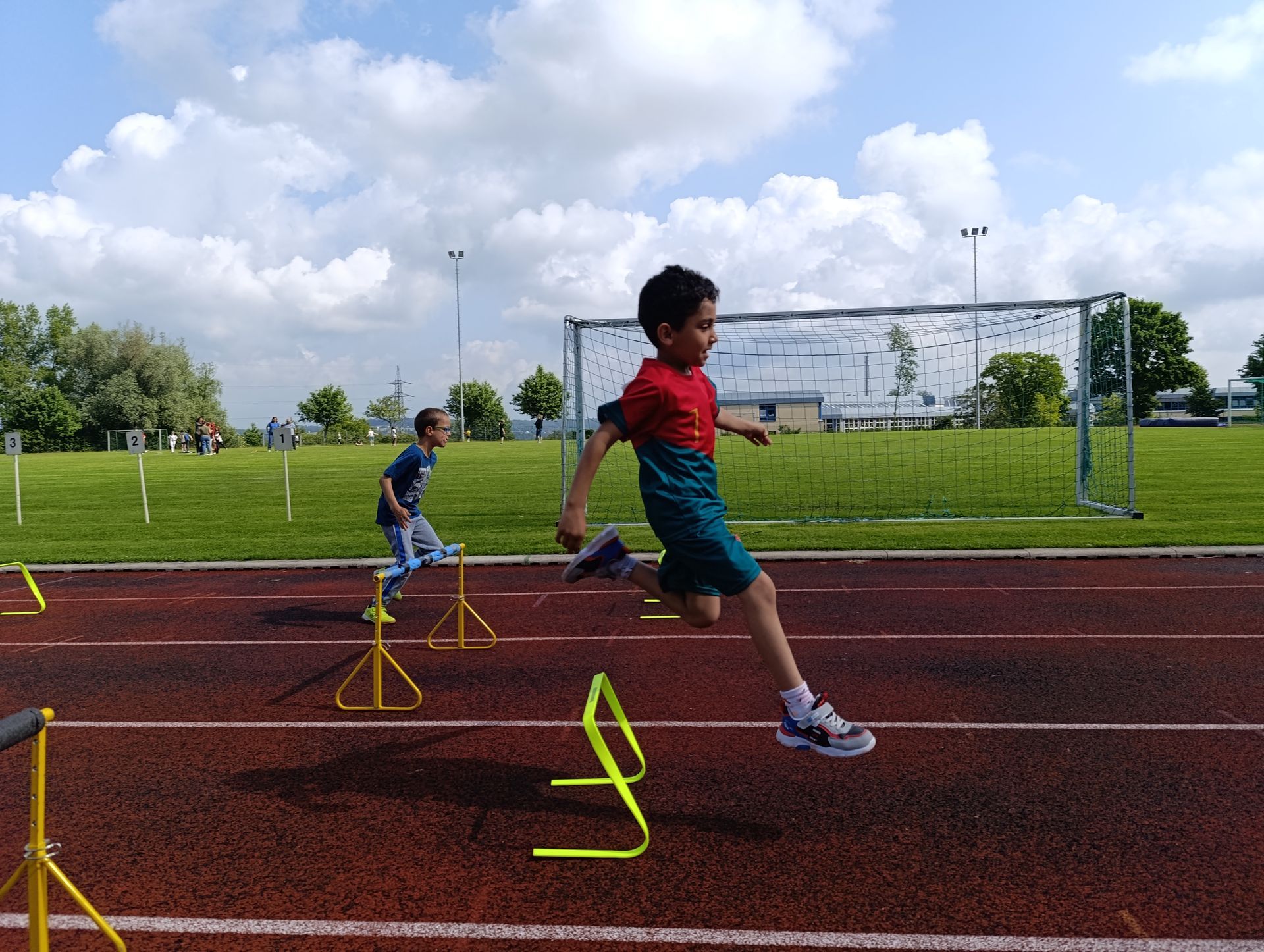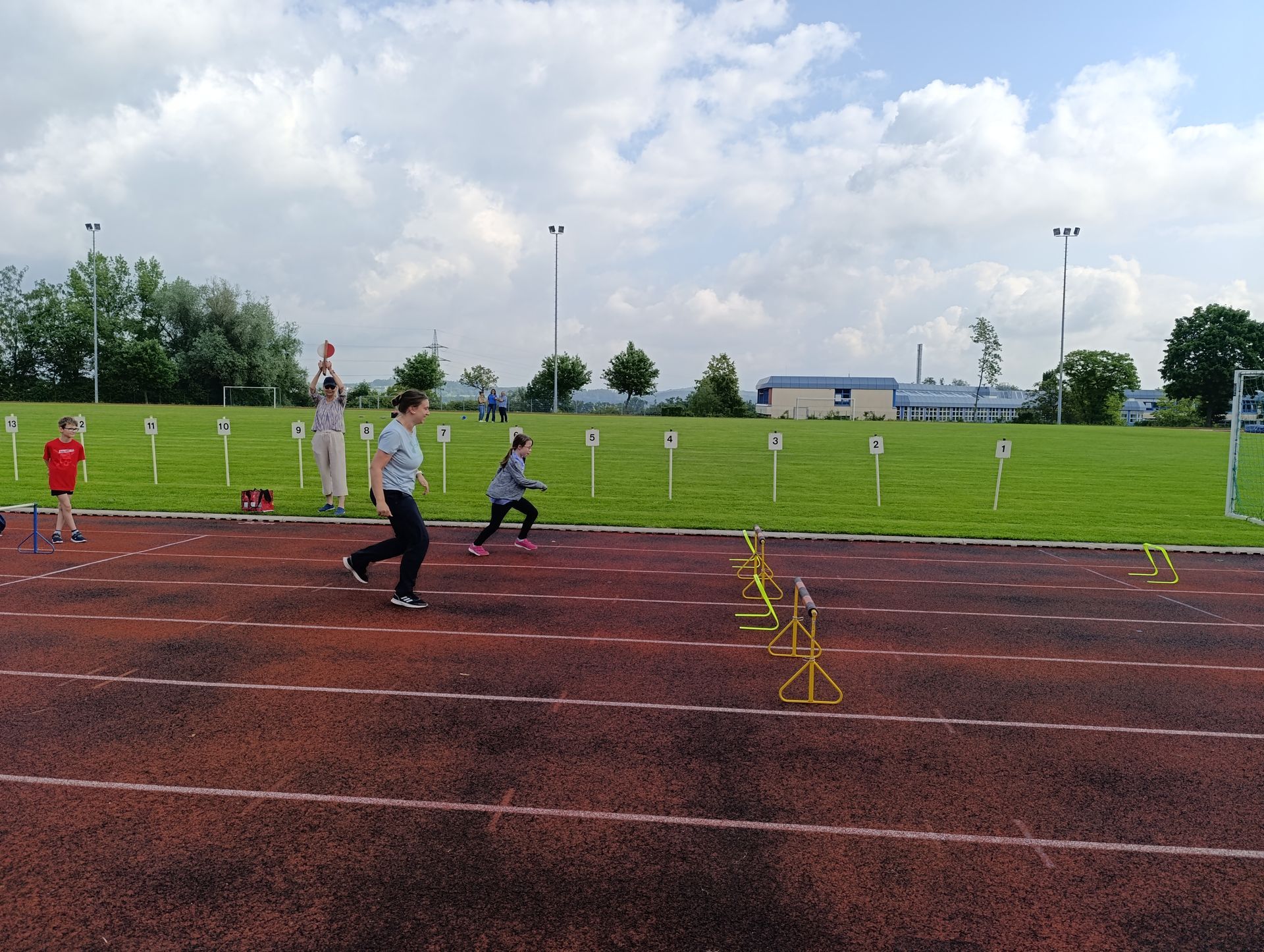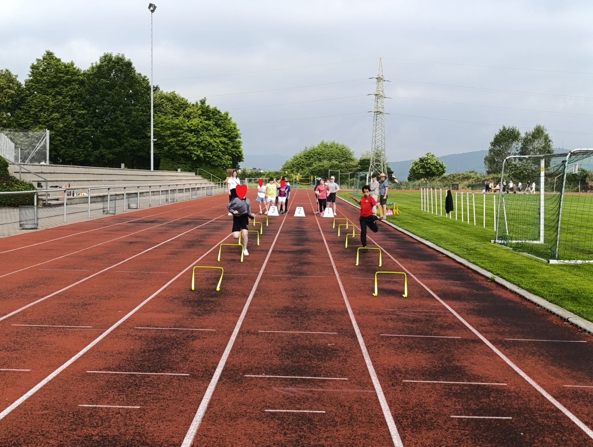 Die Schülerinnen und Schüler waren in verschiedene Riegen eingeteilt und konnten an zahlreichen Stationen ihr Können unter Beweis stellen: Beim Hürdenlauf, Weitsprung, Kugelstoßen und Transportlauf zeigten sie Ausdauer, Schnelligkeit und Geschicklichkeit. Auch die Station „Spielekiste“ bot Gelegenheit zum Austoben und Spaß haben.