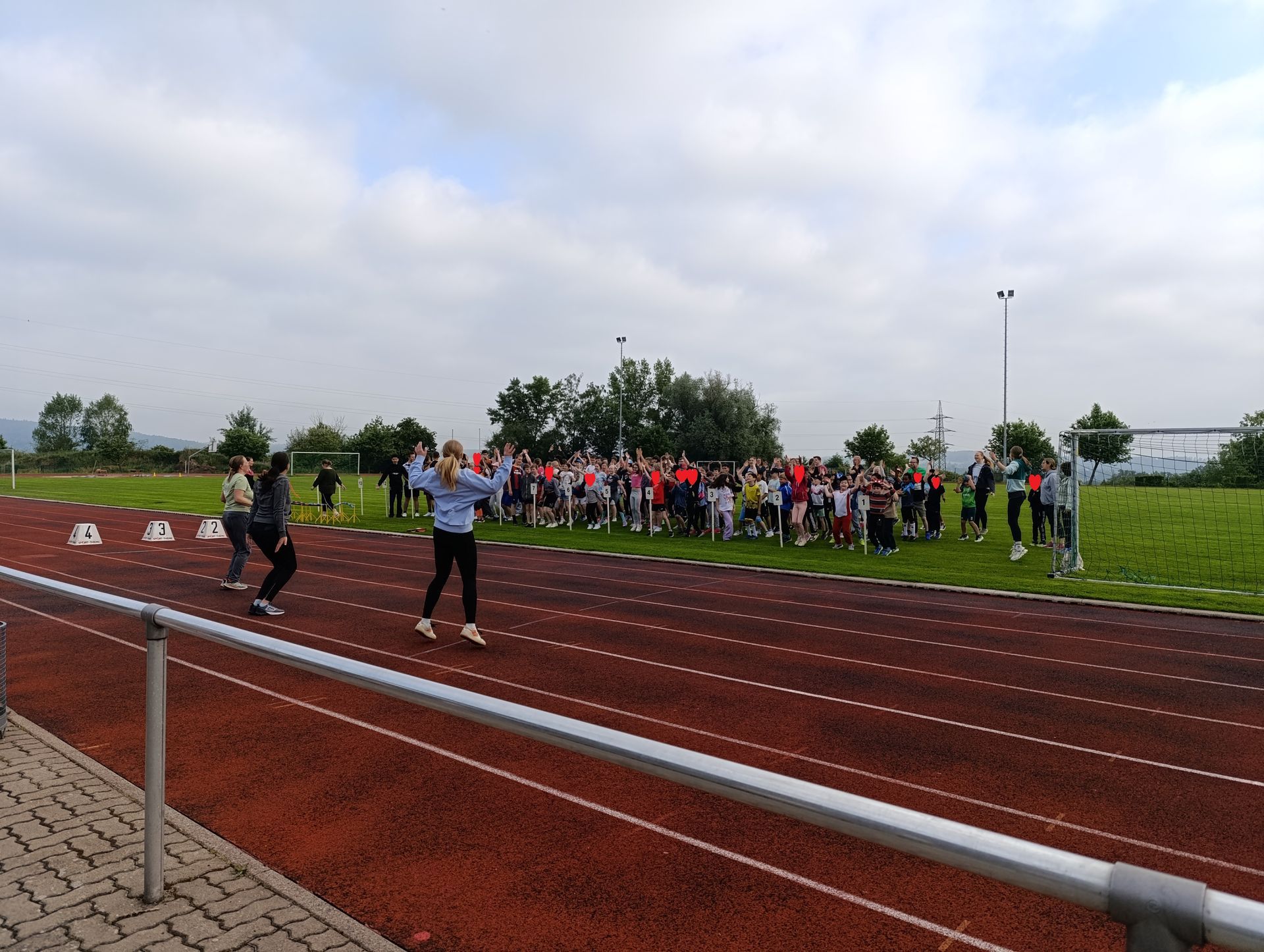 Schulleiterin Frau Donhauser begrüßte alle Schülerinnen und Schüler herzlich und wünschte ihnen viel Freude und Erfolg bei den vielfältigen sportlichen Herausforderungen. Gleich zu Beginn sorgte Frau Puff mit fetziger Musik für eine motivierende Aufwärmphase, bei der sich alle kräftig in Bewegung bringen konnten.