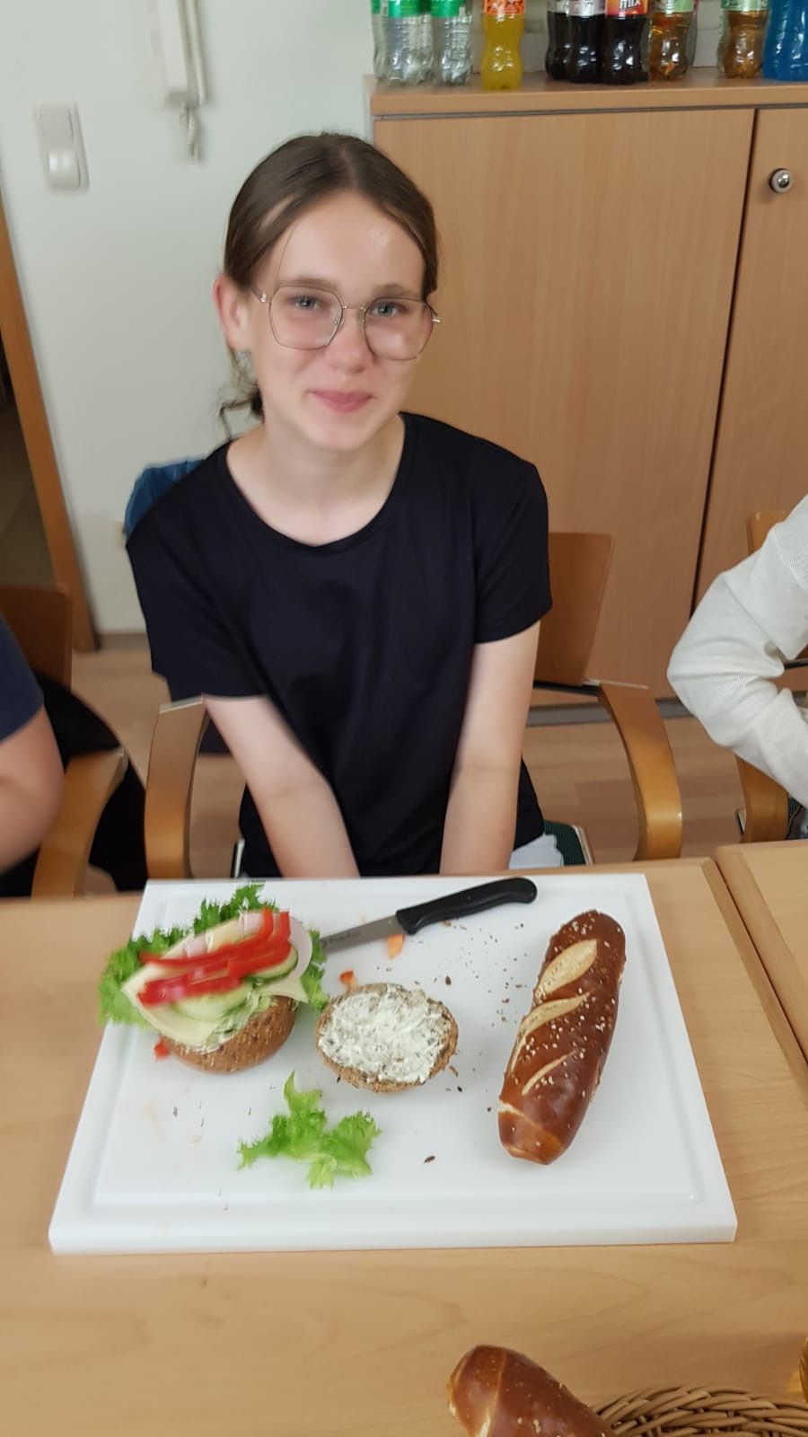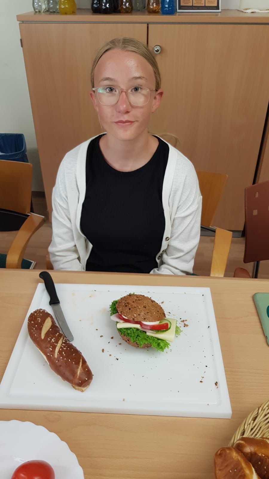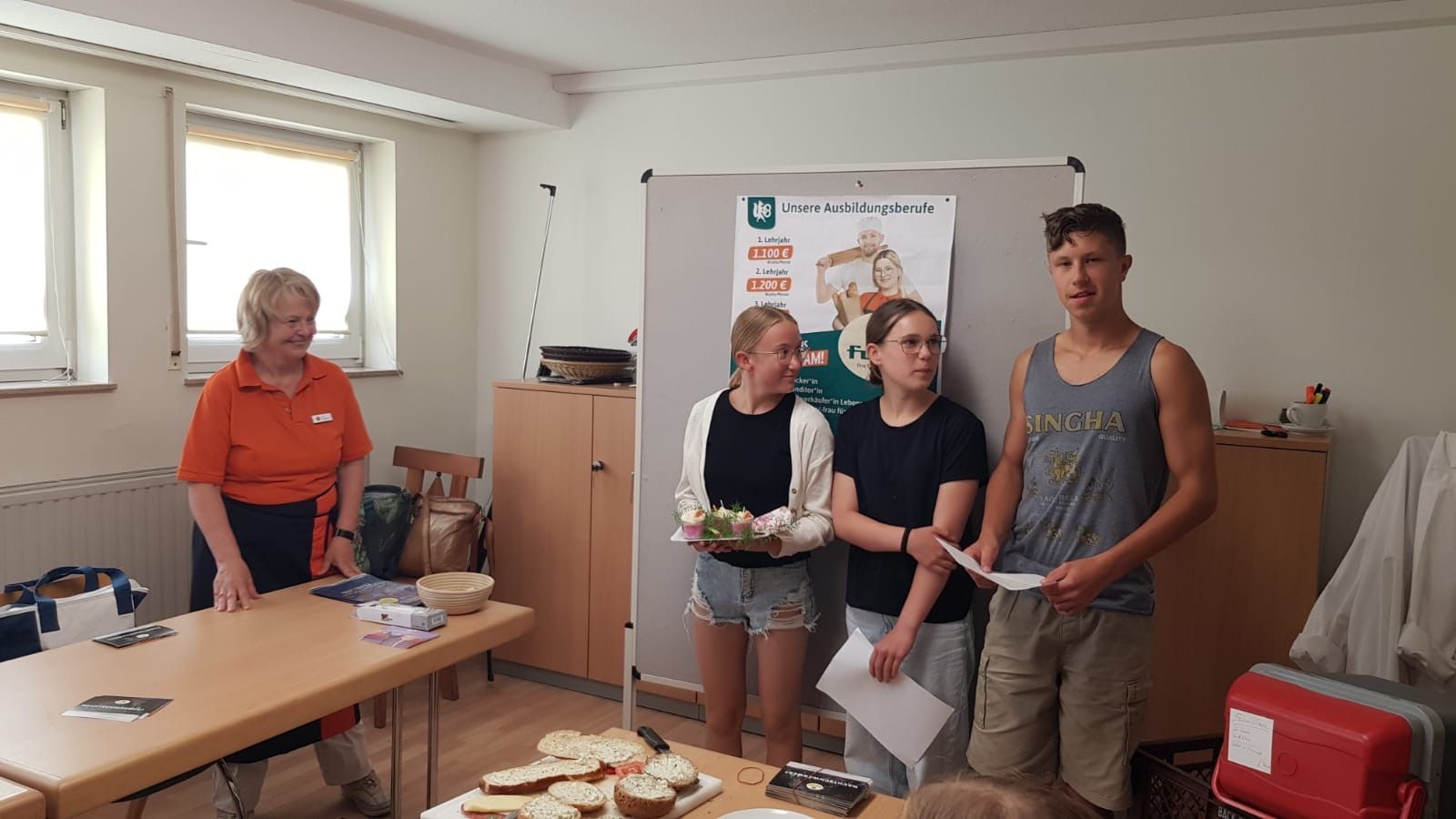 Frau Schmidt von der Bäckerei Fuchs führte die Gruppe durch die verschiedenen Räumlichkeiten und erklärte anschaulich die Funktionen der unterschiedlichen Geräte. Anschließend durften die Schülerinnen und Schüler im Aufenthaltsraum kreativ werden: Sie lernten, wie man Brötchen und Laugenstangen mit Salat, Käse, Wurst, Gurken, Tomaten, Paprika und Eiern schön belegt. Außerdem zeigte Frau Schmidt, wie Amerikaner dekoriert werden. Die Jugendlichen durften nun selbst Brötchen oder Laugenstangen belegen, Amerikaner verzieren, diese essen oder mit nach Hause nehmen.