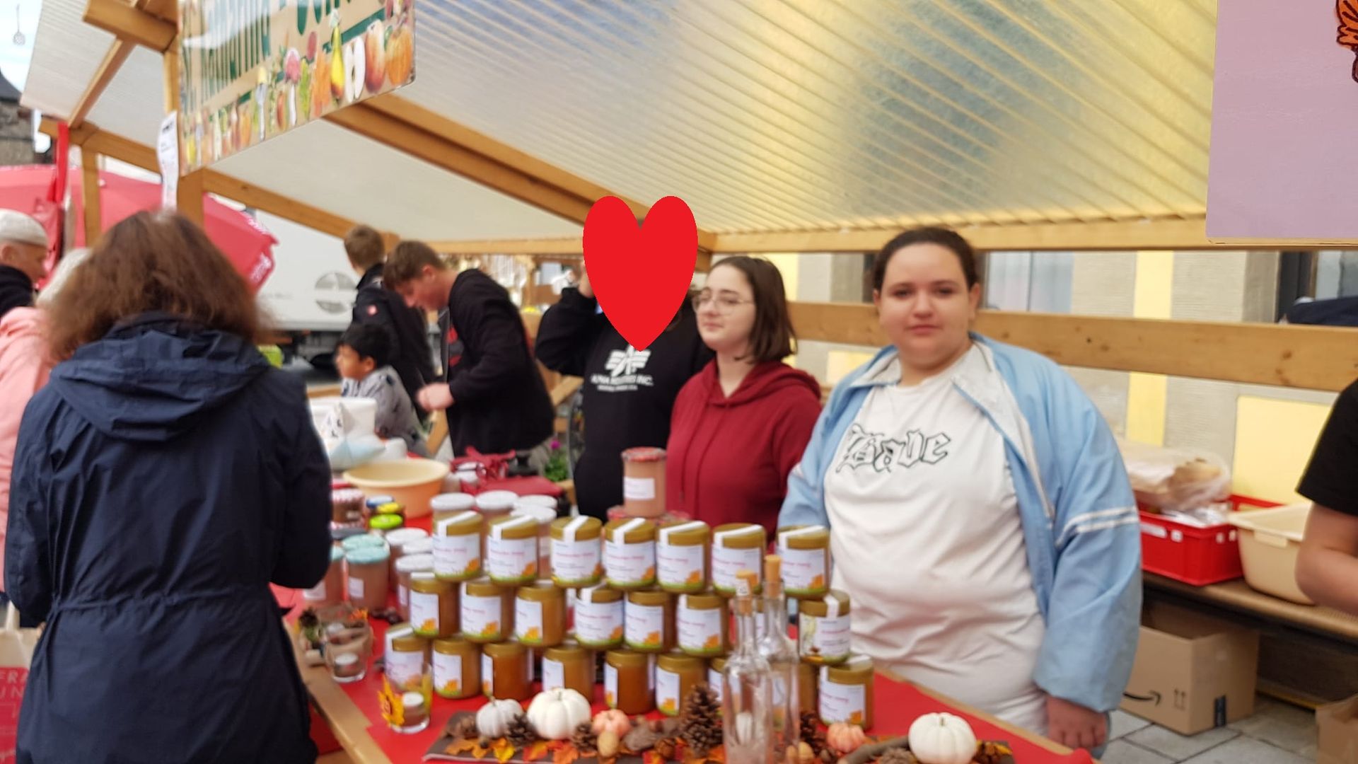 Auch unsere St. Katharina- Schule war mit mehreren Ständen beteiligt. An einem Stand konnte man sich mit heißer Kürbissuppe aufwärmen oder ein leckeres Brot mit weißem Käse genießen. Am anderen Stand konnten die Besucherinnen und Besucher selbstgemachte Wachskerzen, Genähtes und Gestricktes kaufen. Manche Schüler und Schülerinnen bemalten Taschen und Turnbeutel mit verschiedenen Mustern, die auch zum Verkauf standen. Weiterhin gab es selbstgepressten Apfelsaft, selbstgemachten Honig, Marmelade und Quittengelee, Äpfel, Kartoffeln, Kürbisse und Nüsse. Eltern und Lehrer*innen backten leckere Kuchen, von denen zum Schluss nichts mehr übrigblieb. Dazu gab es köstlichen Kaffee.