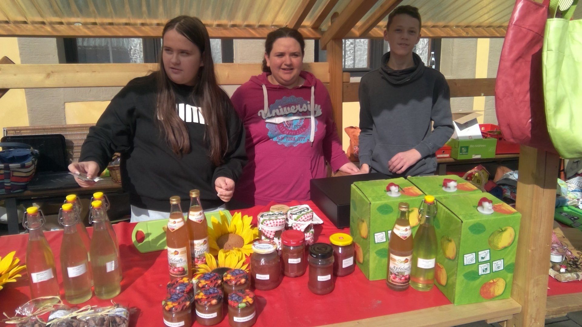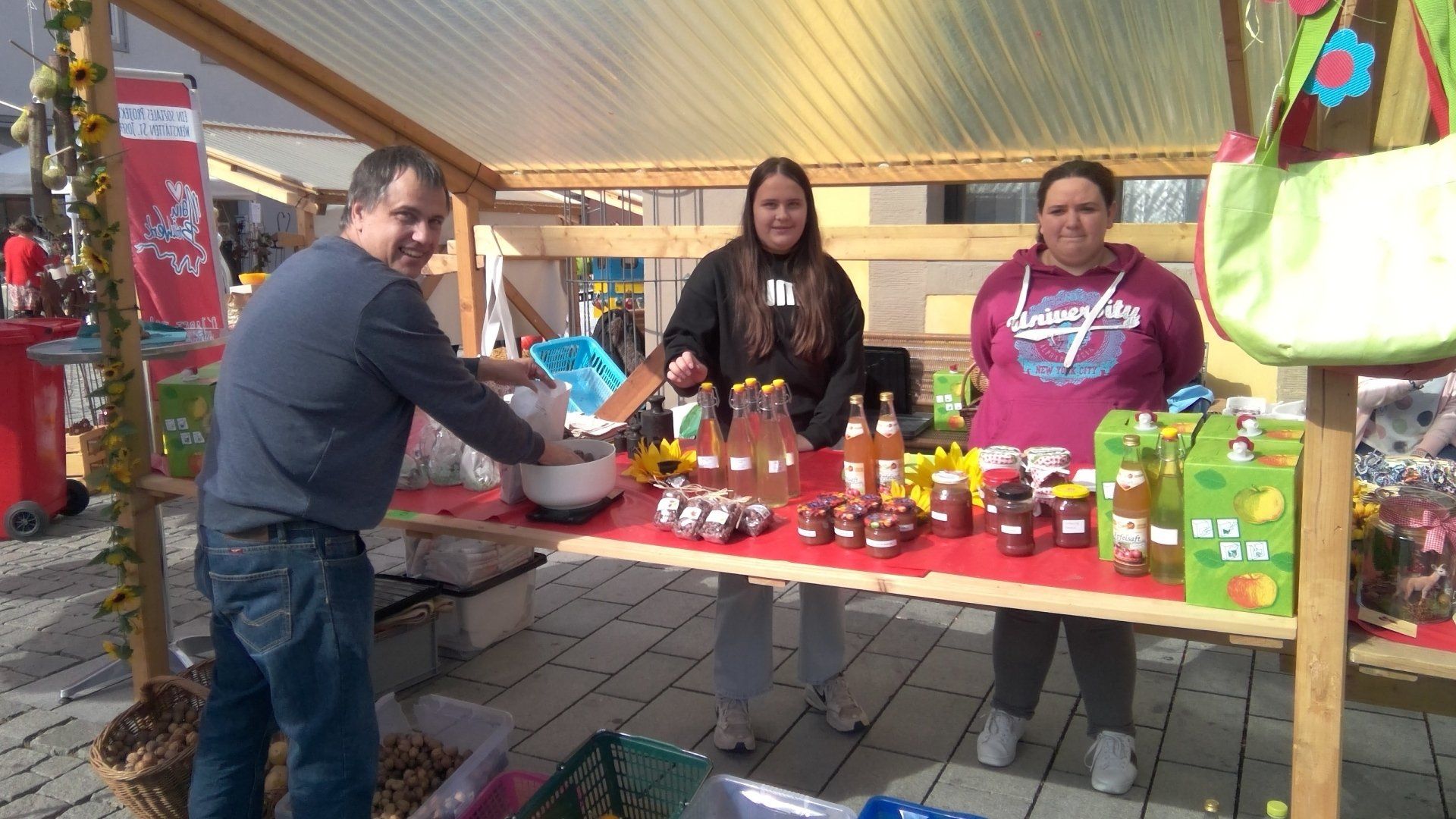 Es gab frische Birnen, Äpfel, Nüsse, Kartoffeln, Quitten, Kürbisse, selbstgemachte Marmelade, gebrannte Mandeln, Holundersirup, gestrickte Socken, Schals, Stirnbänder, Mützen, Armbänder, Lesezeichen, selbst gegossene Kerzen und noch vieles weiteres Gebastelte. Für Hungrige gab es selbstgemachten Kuchen und Muffins, dazu frischen Kaffee, weiterhin hatten wir leckere Brote mit Griebenfett, weißem Käse und rohem Schinken im Angebot. Auch leckeren Apfel- und Quittensaft verkauften wir. Dazu sammelten Schüler*innen aus unserer Schule ein paar Tage zuvor viele Äpfel und Quitten auf den Streuobstwiesen in Klosterbanz und im Schulgarten auf. Einen Tag später fuhren manche Schüler*innen der Klasse L8 zusammen mit Frau Vonbrunn und dem gesammelten Obst nach Burgkunstadt zur Saftpresse und stellten daraus köstlichen Apfel- und Quittensaft her.