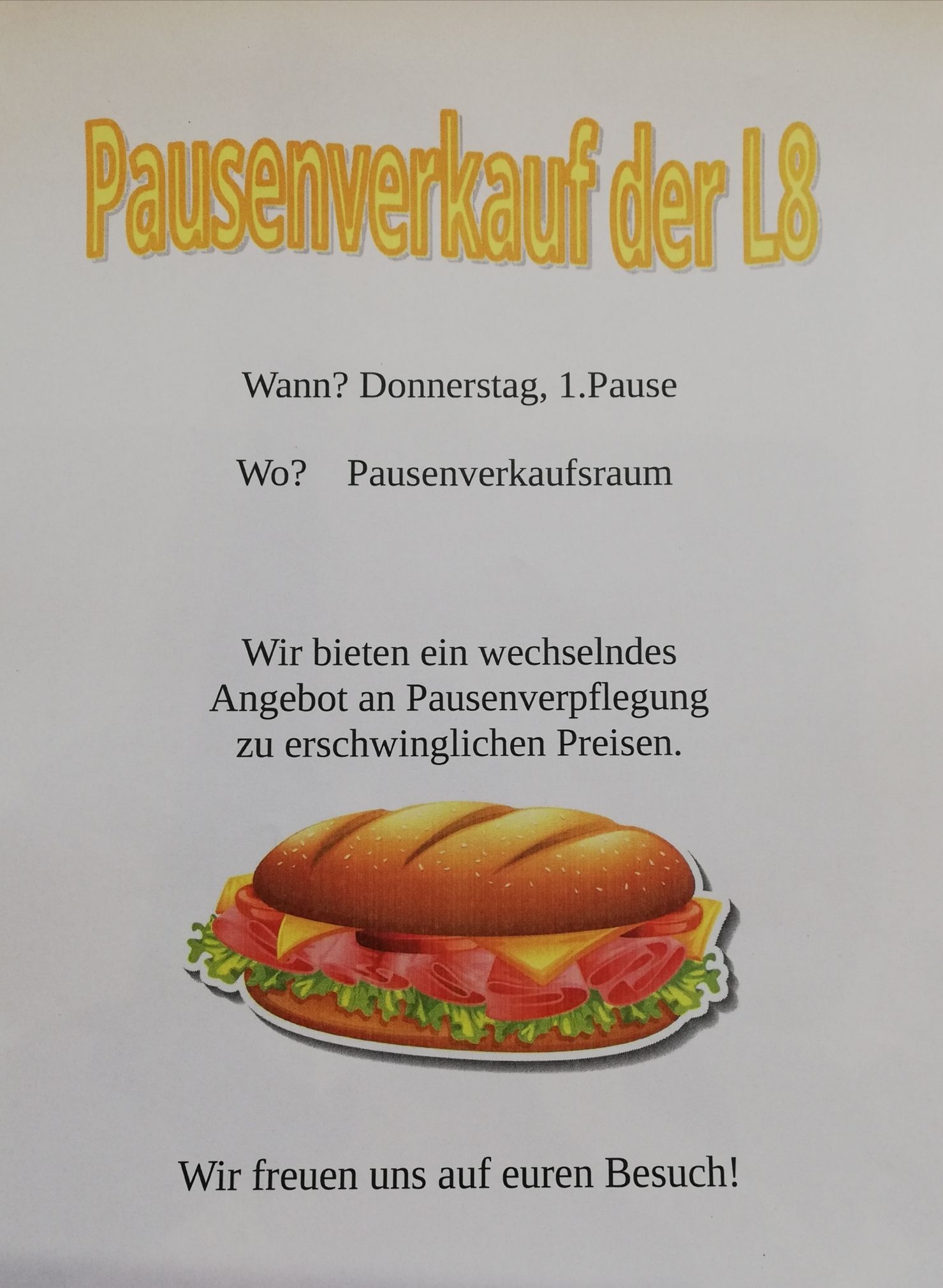 Ab Donnerstag, den 14.11.2024 findet der erste Pausenverkauf der L8 im Pausenverkaufsraum statt.