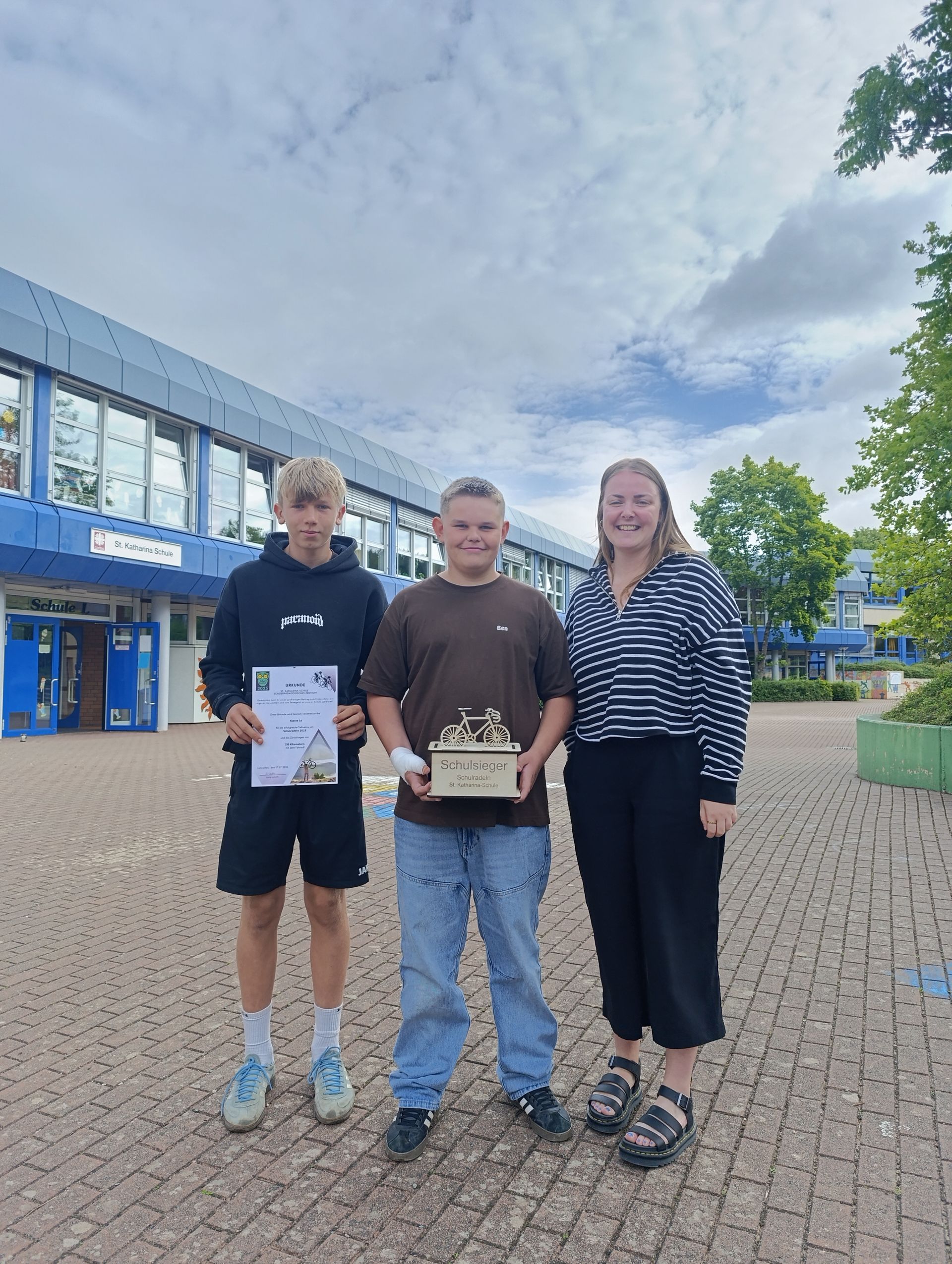 Ein weiteres Highlight war die Ehrung des Schulradelns, das im Landkreis Lichtenfels erstmals stattfand und von Frau Mahr und Herrn Kettler organisiert wurde. Ziel war es, 2.500 km zu radeln – die Schülerinnen und Schüler der St. Katharina-Schule schafften beeindruckende 2.967 km! Von 66 teilnehmenden Schulen und Firmen belegte unsere Schule den stolzen 14. Platz. Insgesamt radelten 78 Schülerinnen und Schüler mit, und jede Klasse erhielt eine Urkunde, die von den Klassensprechern entgegengenommen wurde. Besonders stolz ist die Klasse L6, die die meisten Kilometer zurücklegte und den Wanderpokal gewann. Alle Beteiligten waren begeistert und stolz auf ihre Leistungen.
