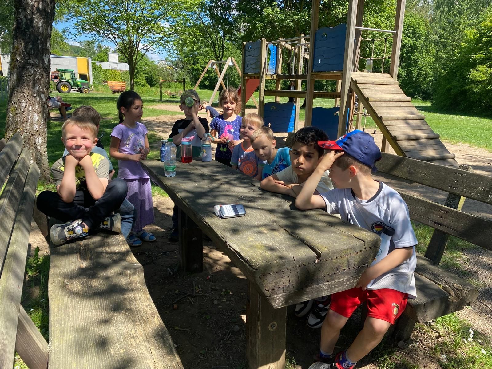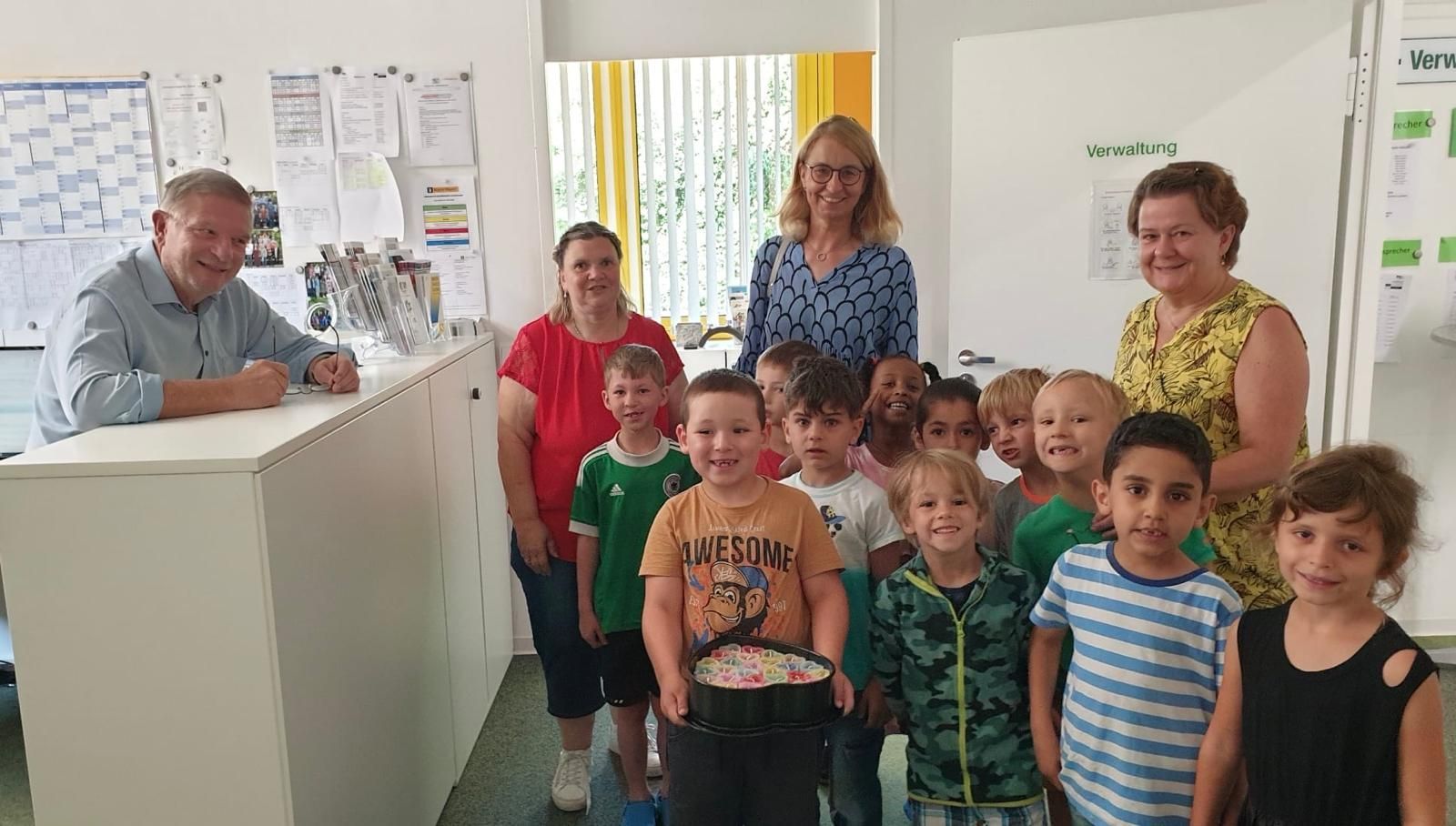 Das Lied „Ich schenk dir einen Regenbogen“, sangen alle 12 Kinder mit den Lehrkräften Frau Orlett und Frau Marr. Mitgekommen war auch unsere Schulleitung Frau Donhauser, um sich im Namen der Schule nochmals persönlich für die unkomplizierte und stets freundliche Zusammenarbeit bei Rektor Herr Heinbuch und seinem Team zu bedanken.