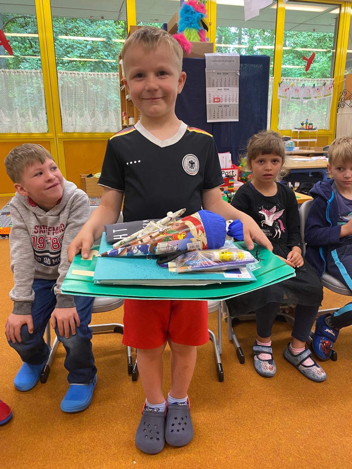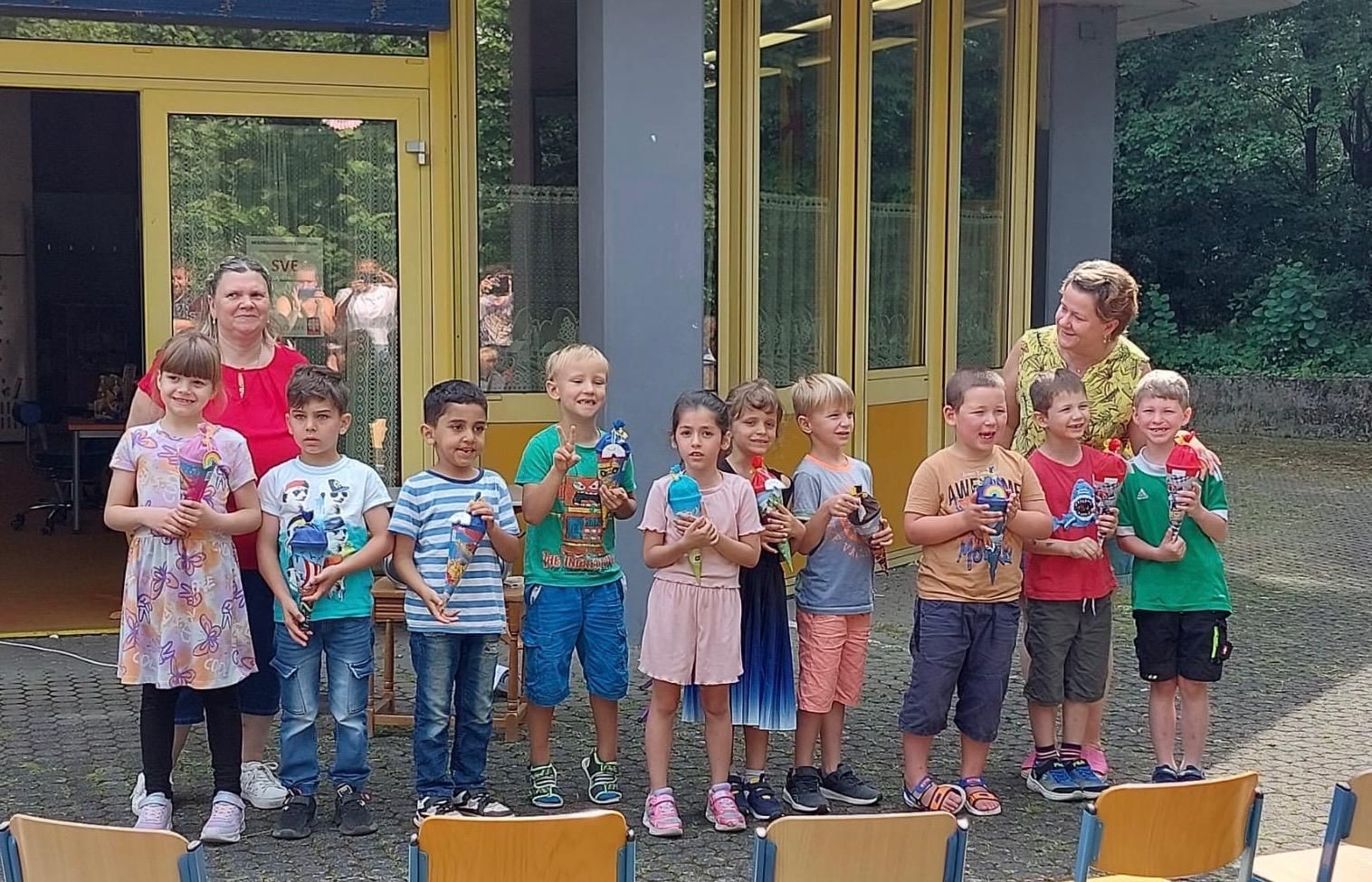 Ebenfalls am 19. Juli um 10 Uhr war dann alles für die Verabschiedung der Vorschulkinder im Gruppenraum und der Terrasse hinterm Haus vorbereitet. Eingeladen waren Eltern, Angehörige und die beiden Busfahrer des Malteser Fahrdienstes. Im Mittelpunkt standen natürlich unsere 10 Vorschulkinder. Mit dem Tanz: „Wir wollen aufstehn`, aufeinander zugehn`, voneinander lernen, miteinander umzugehn`, eröffneten Frau Marr und Frau Orlett die Feierstunde. Jedes Vorschulkind wurde nun gebeten auf seinen Stuhl zu steigen. Ein kurzer, selbergedichteter Vers zu jedem Kind lockerte die andächtige Stimmung gleich wieder auf. Jedes Kind bekam neben Glückwünschen für den Schulstart einen ganzen Stapel voll angefertigter Mappen und natürlich die heißgeliebte SVE-Schultüte. Nach einem Jahr haben sich viele Arbeitsblätter, Bastelarbeiten, Fotos und Zeichnungen angesammelt. Besonders schön, erklärte die Gruppenleitung Frau Marr, war die Gestaltung der Bienenmappe und das lustige Sprechzeichnen.