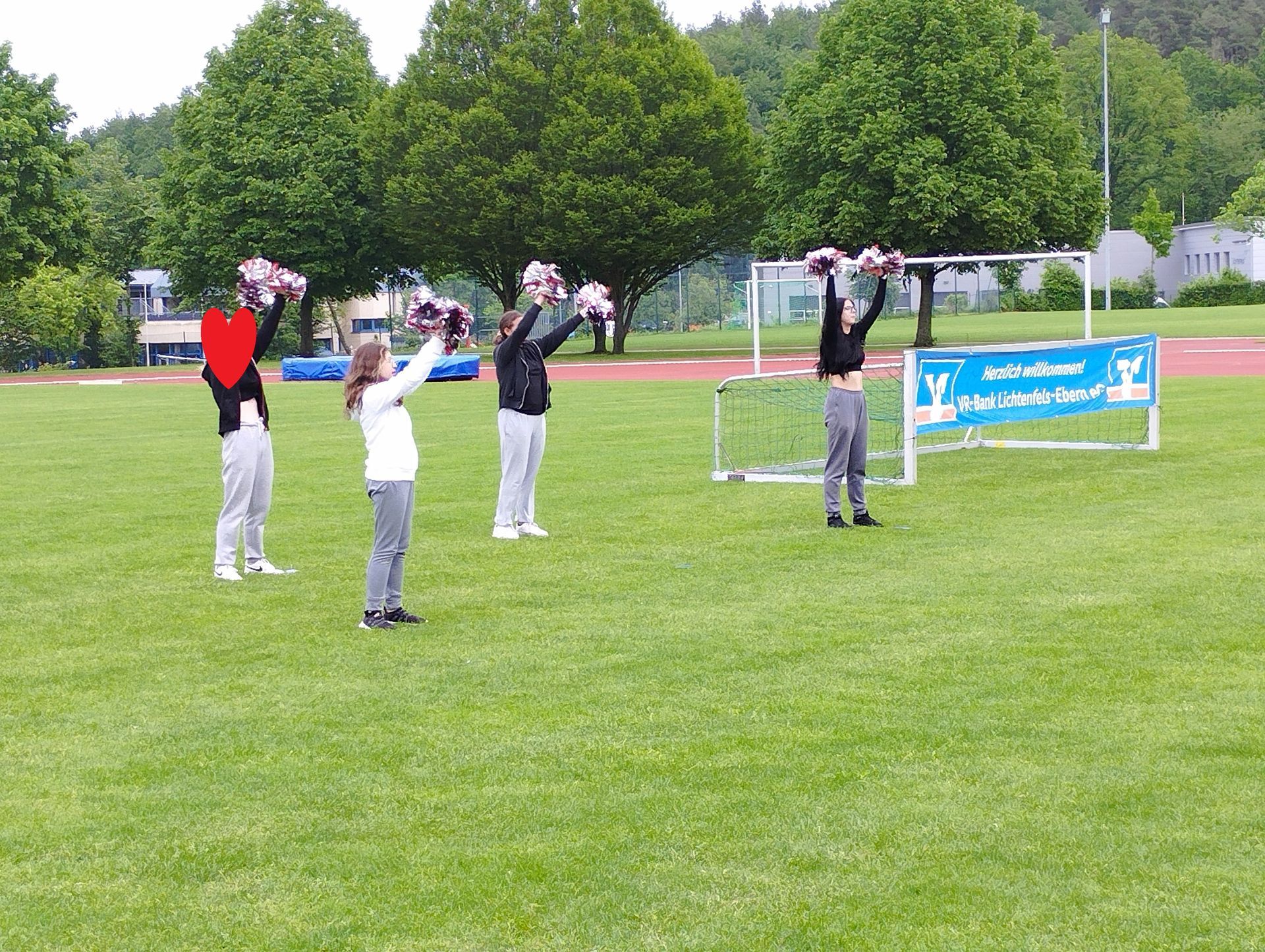Äußerst beeindruckend war gleich am Anfang der Tanz der Cheerleadergruppe der St. Katharina-Schule, die sich unter Schwingen mit ihren Pompons zum Rhythmus der Musik bewegte und die Schülerschar zum Mitklatschen animierte und in Stimmung brachte. Anschließend machten zwei Lehrkräfte mit den Schülern unter fetziger Musikbegleitung Aufwärmübungen, um sie für das bevorstehende sportliche Event vorzubereiten.