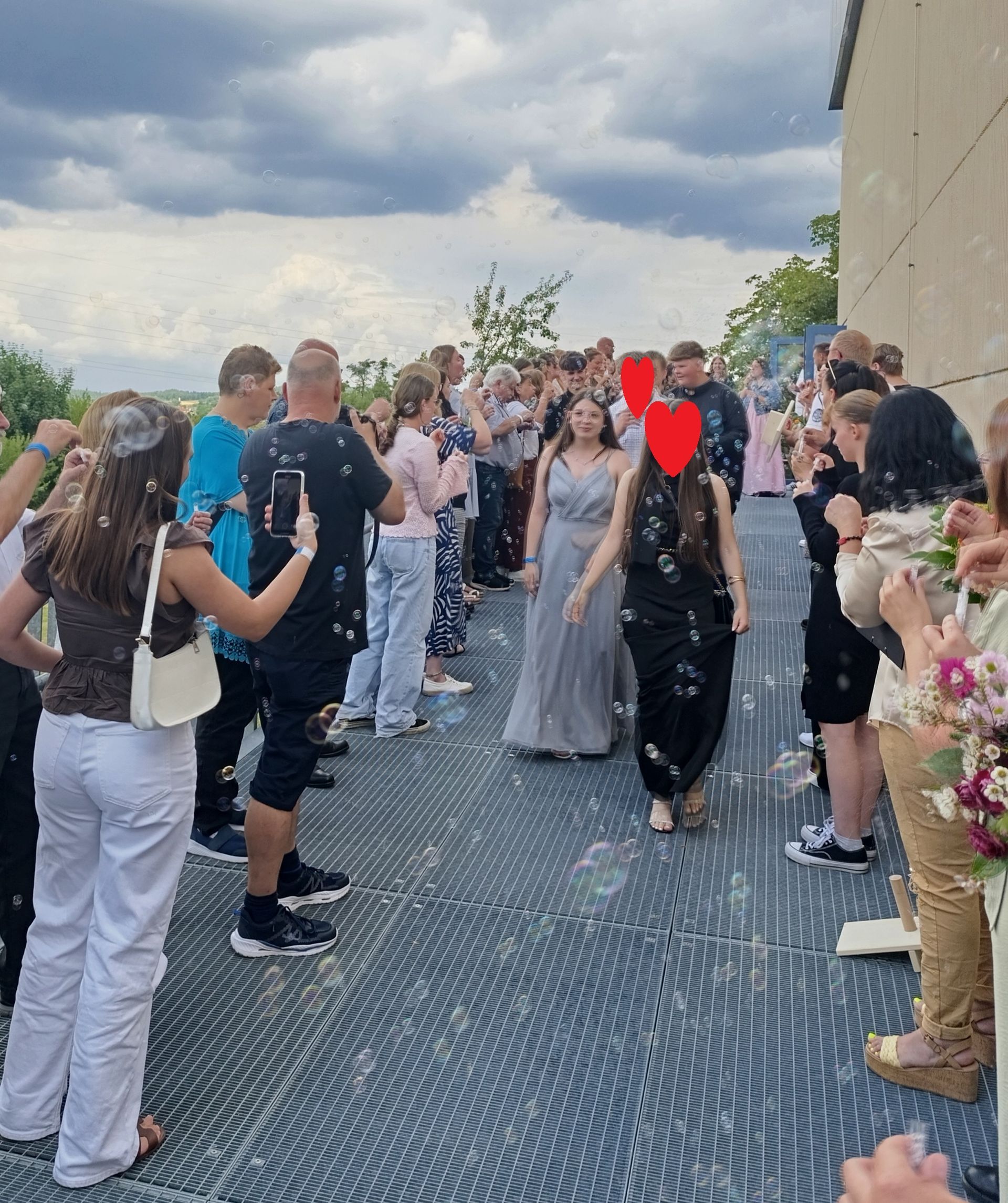 Zum Abschluss bedankten sich die Neuntklässler bei den Lehrerinnen und Lehrern, bei Frau Donhauser sowie bei der Elternbeiratsvorsitzenden, Frau Lutz, mit einem Blumenstrauß. Frau Donhauser lud alle Anwesenden ein, den Tag bei einem gemeinsamen Buffet im Garten ausklingen zu lassen. Die Schülerinnen und Schüler gingen durch ein Spalier, während die Anwesenden Seifenblasen in die Luft bliesen – ein wunderschöner Abschluss für einen unvergesslichen Tag.