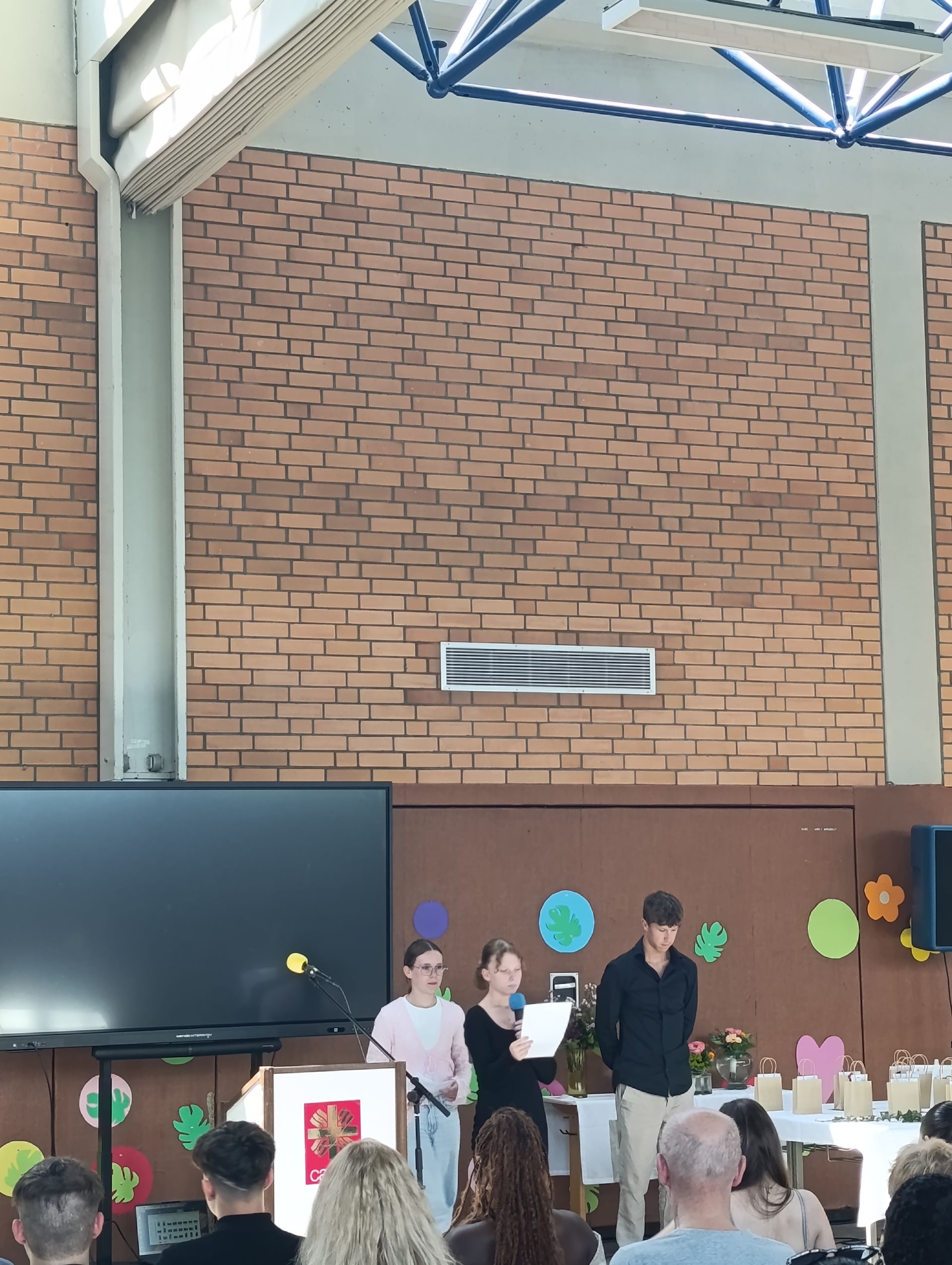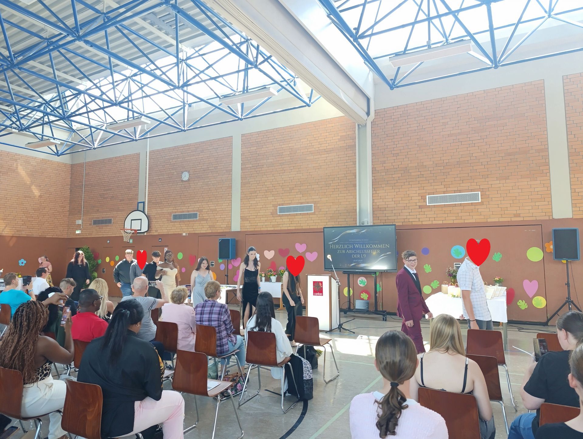 Es folgte das Musikvideo „Fly like an eagle“, das die Klasse L5/L6 per Video präsentierte und die Gemeinschaft und Kreativität unserer Schüler zeigte. Die drei Schülersprecher hielten eine herzliche Rede, in der sie den Abschlussschülern alles Gute und viel Erfolg für den weiteren Lebensweg wünschten. Als kleine Erinnerung überreichten sie den Schülern einen Schlüsselanhänger.