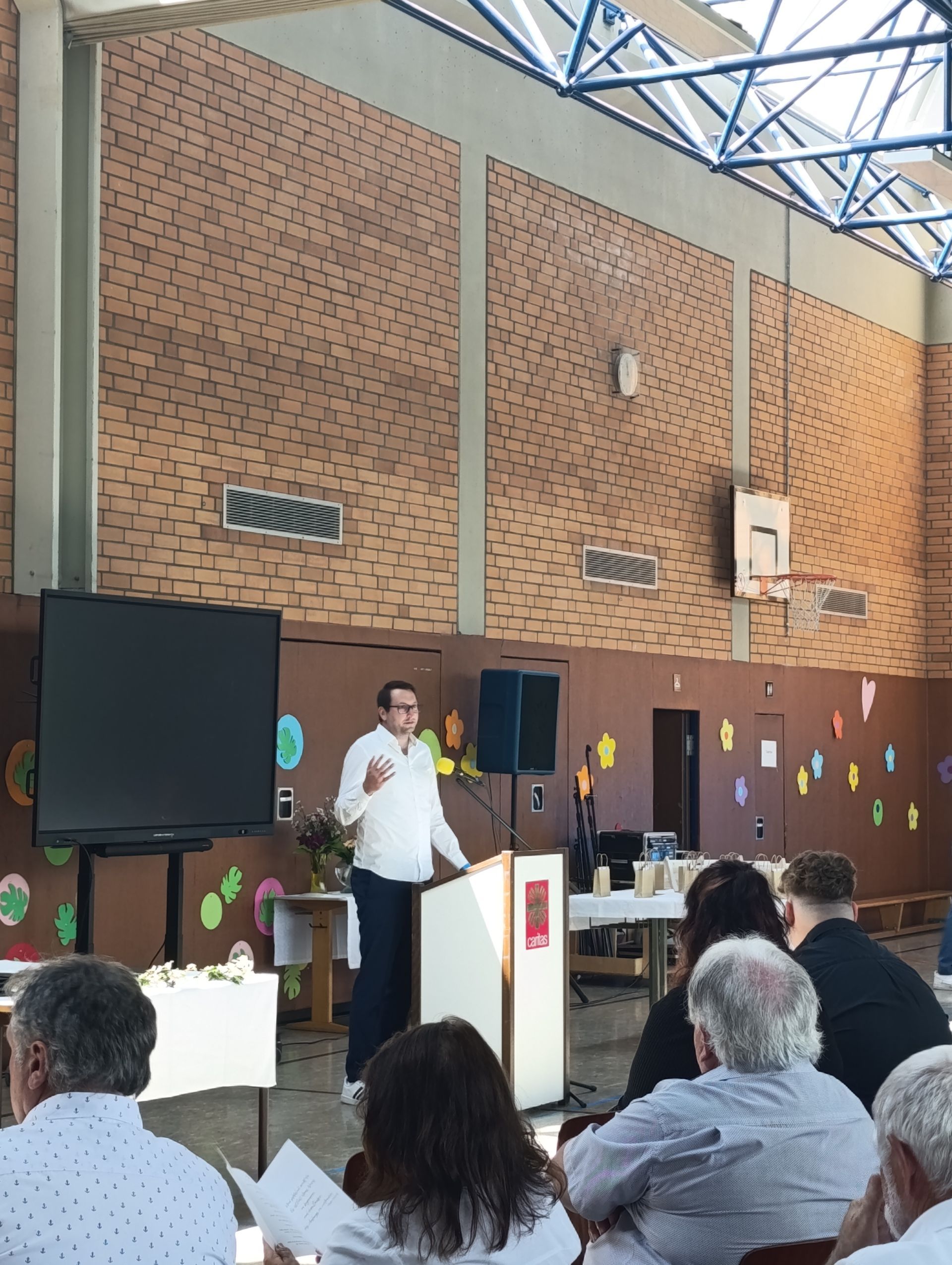 Der Klassenlehrer, Herr Feulner, bedankte sich bei allen Mitwirkenden der Abschlussfeier. Mit humorvollen Anekdoten aus dem Schulalltag und persönlichen Bemerkungen zu jedem Schüler sorgte er für viele Lacher und schöne Erinnerungen. Schule bedeutet nicht nur Leistung, sondern auch Menschlichkeit. Er ermutigte die Schüler, ihren Weg zu gehen, hilfsbereit zu bleiben und ihren Humor zu bewahren.