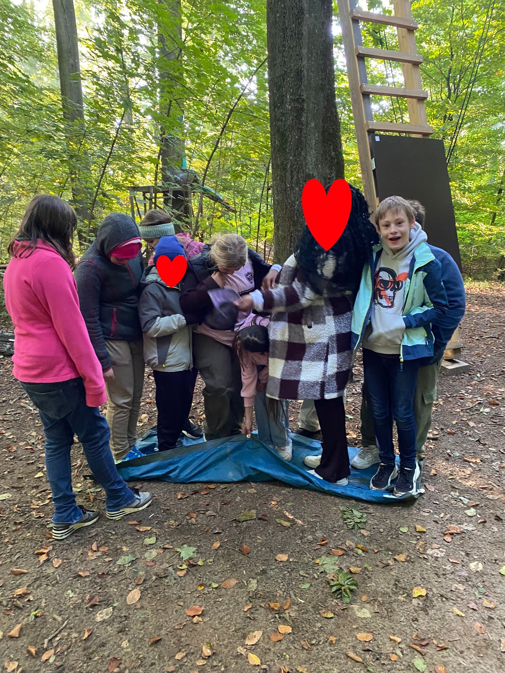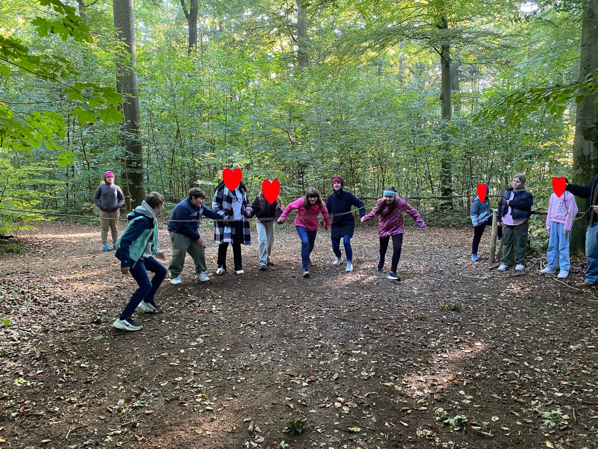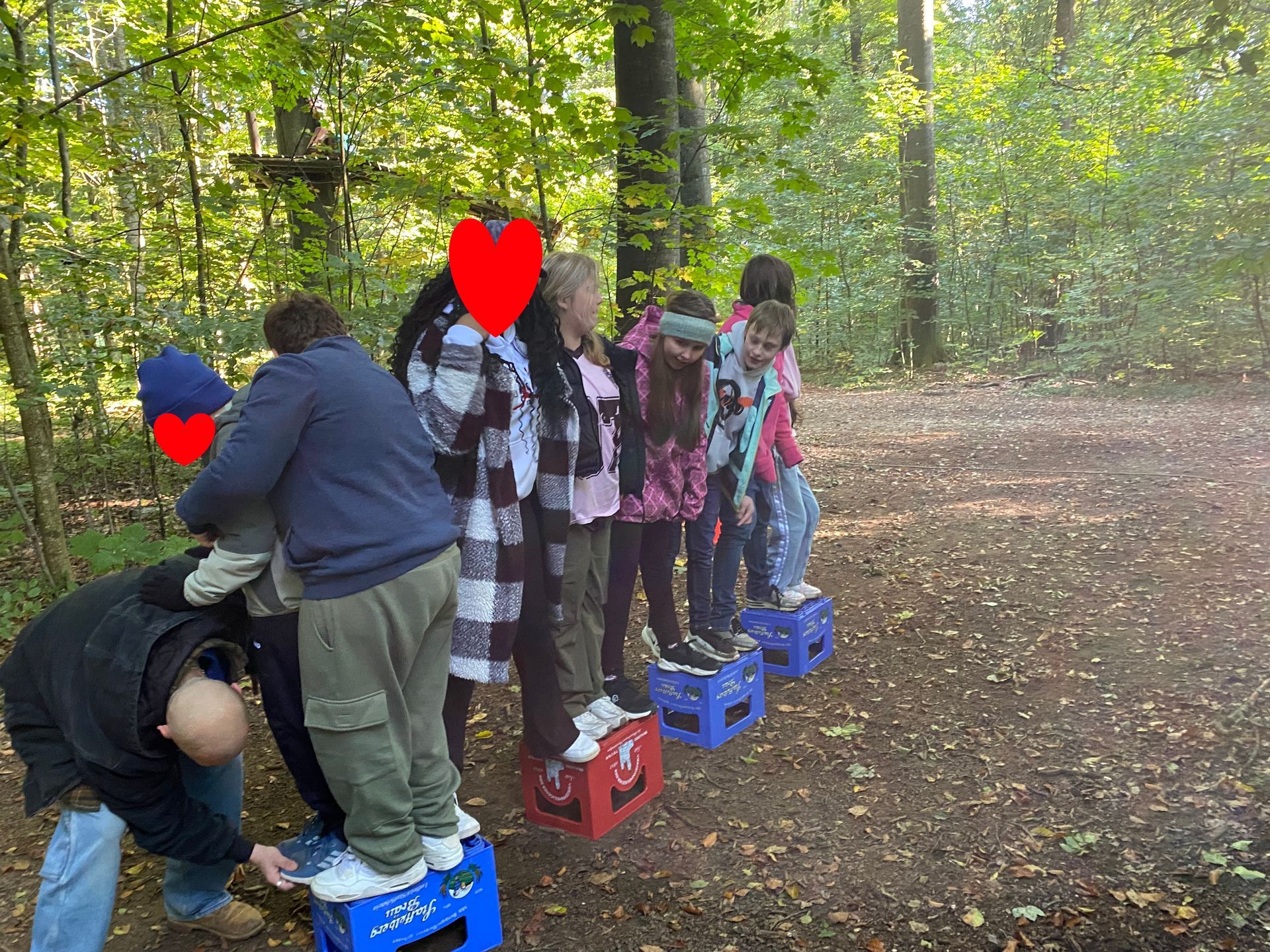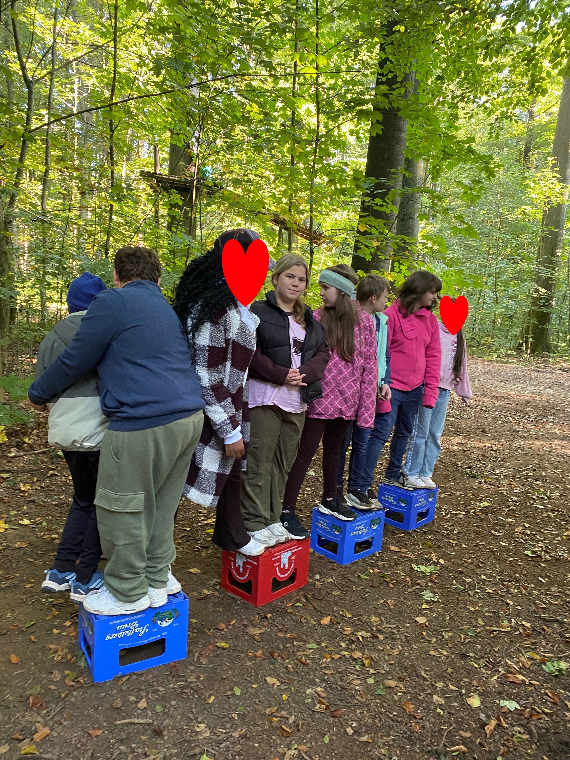 Beim Spiel „Säurefluss“ bekamen wir leere Getränkekästen und mussten mit jeweils einem Bein auf einem anderen Kasten stehen. Ziel war es, die Kästen so zu verschieben, dass wir den imaginären Fluss überqueren konnten. Wenn kein Fuß mehr auf einem Kasten stand, rutschte dieser weg, sodass wir schließlich zu viert auf einem Kasten standen. Herausfordernd, aber sehr lustig! Danach stand das „Planenspiel“ auf dem Programm: Wir platzierten uns alle auf einer Plane. Die Plane sollte so umgedreht werden, dass niemand den Boden berührt. Auch dieses Spiel bereitete uns viel Freude.