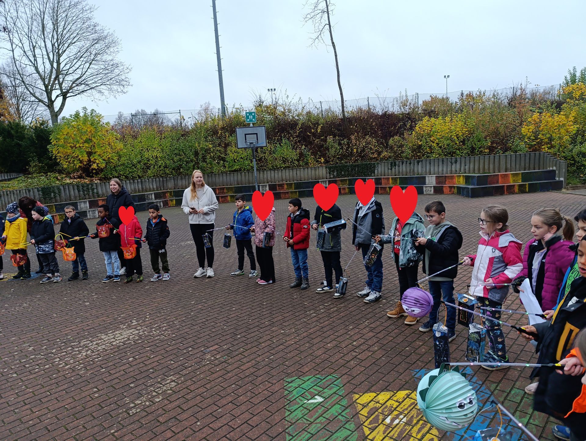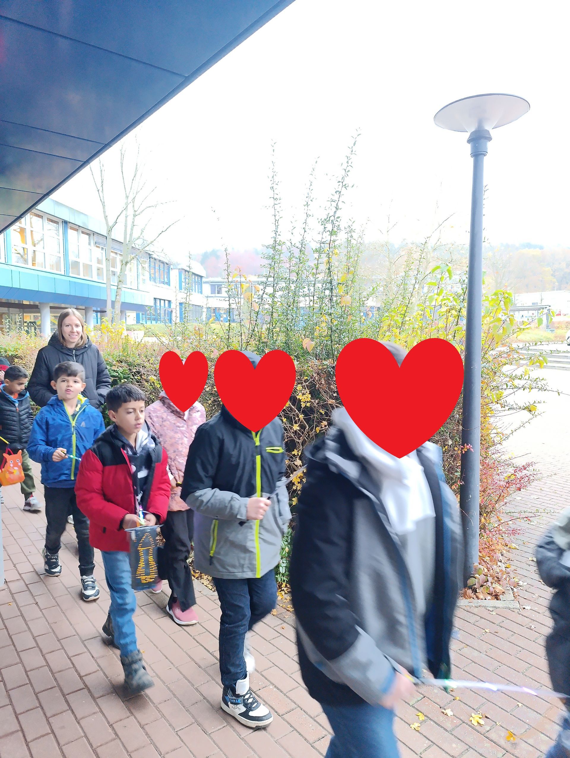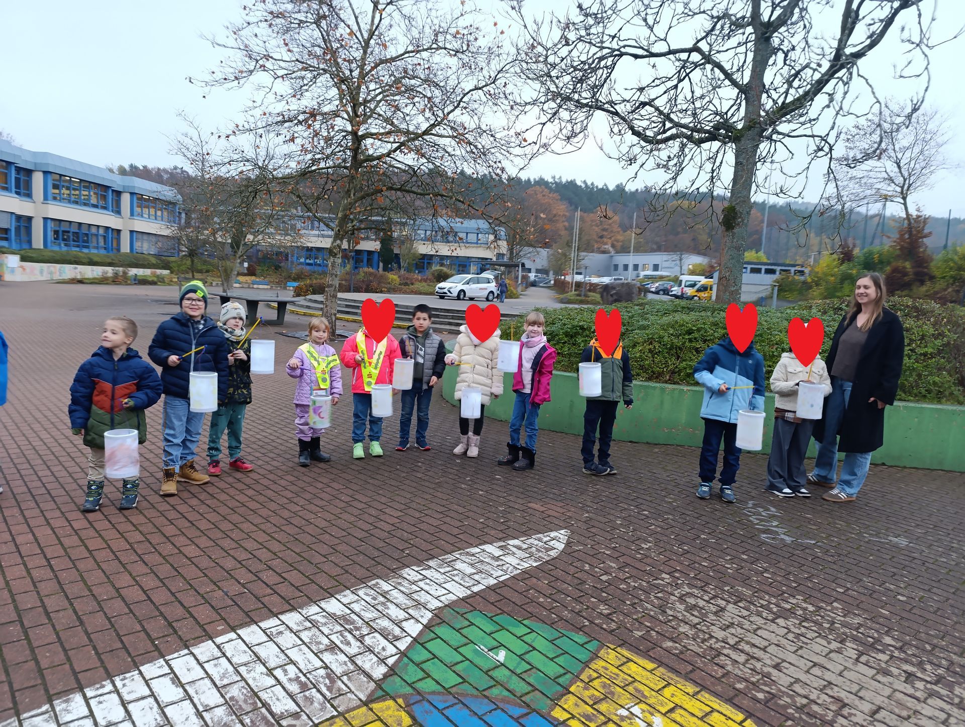 Gleich zu Schulbeginn trafen sich die Diagnose- und Förderklassen sowie die Stütz- und Förderklasse 1/2 im Pausenhof. Wochen zuvor hatten wir bereits unsere wunderschönen Laternen gebastelt, und nun erstrahlten sie im Schein der ersten Morgensonne.