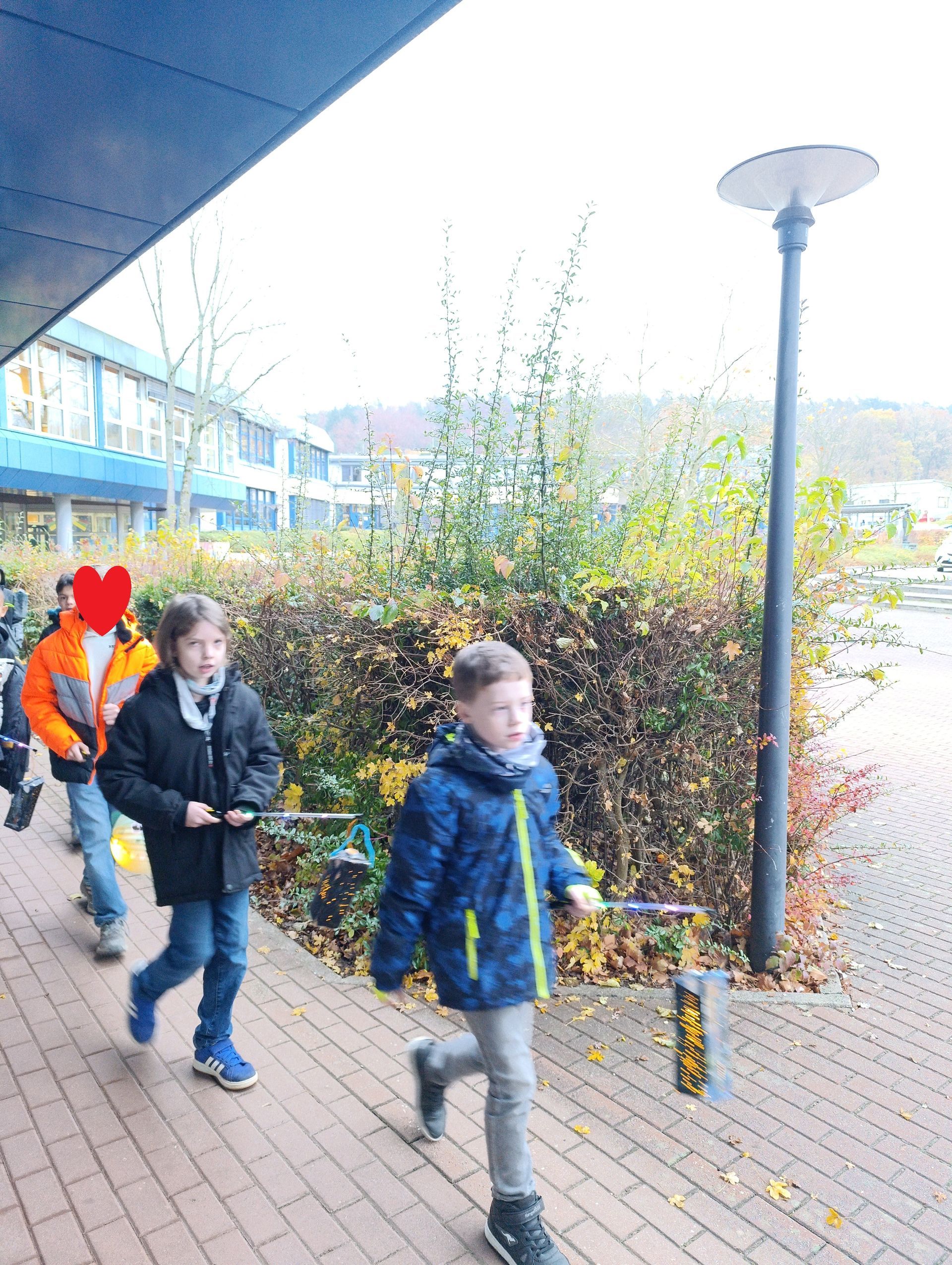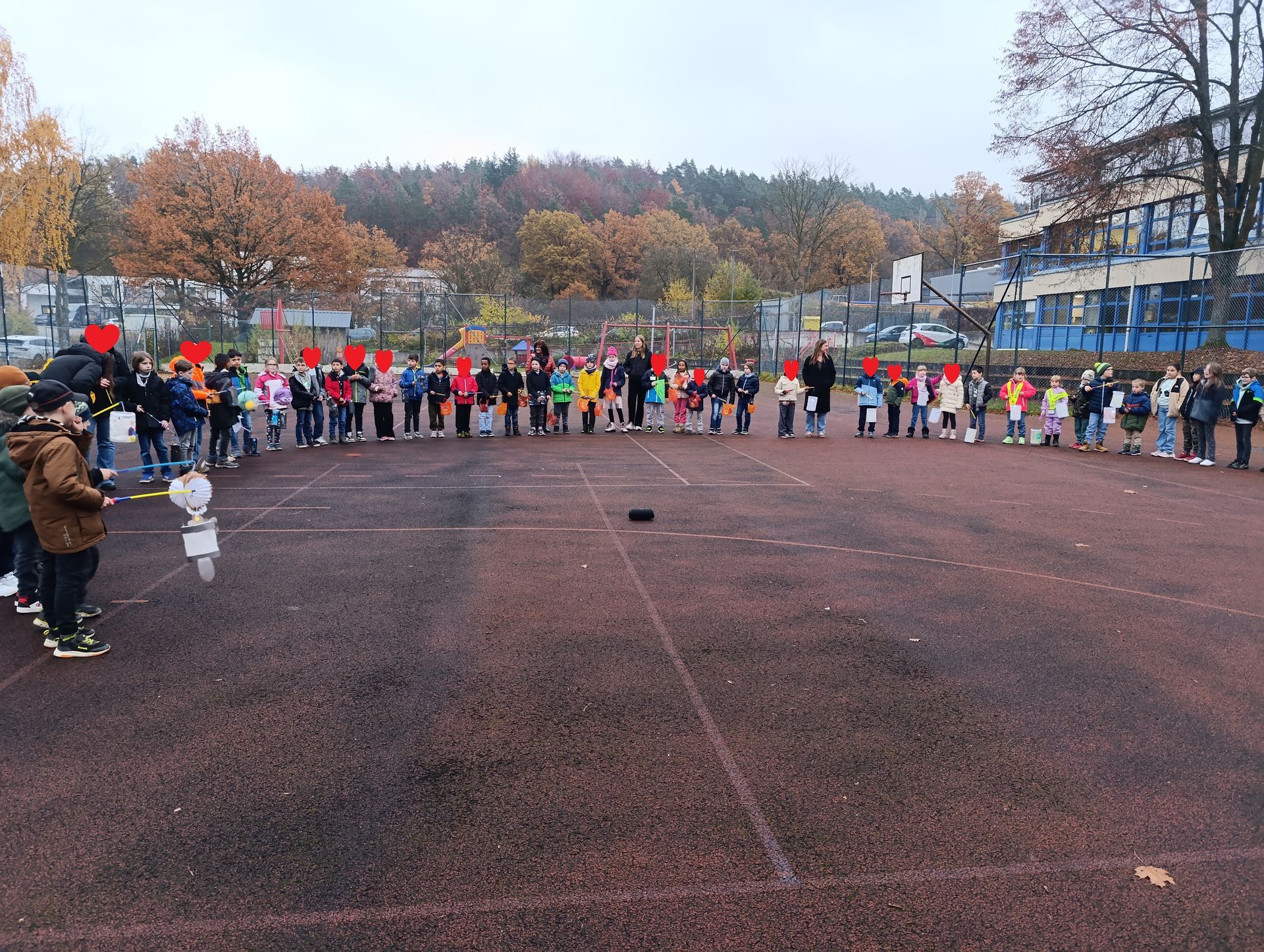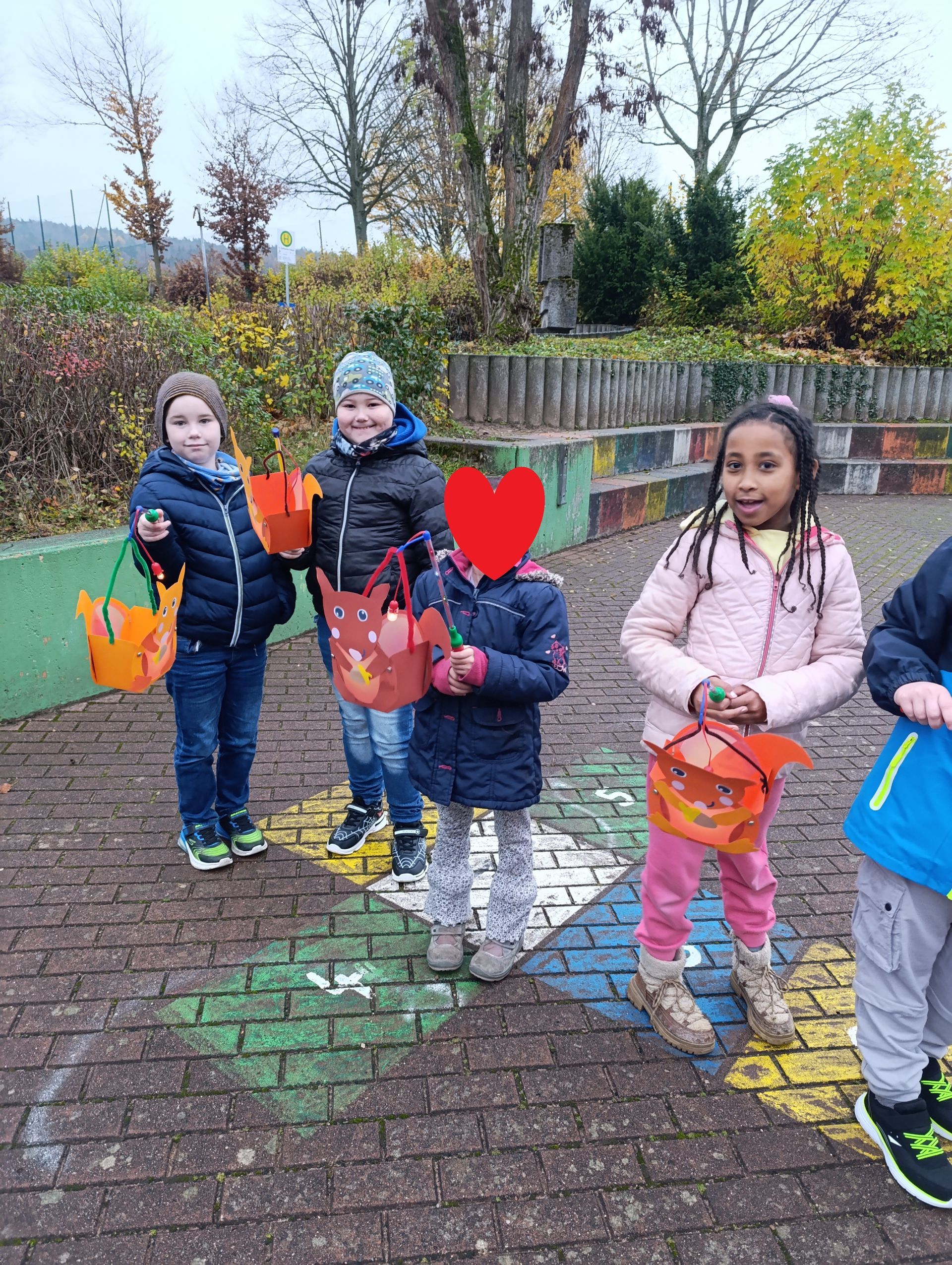 Gleich zu Schulbeginn trafen sich die Diagnose- und Förderklassen sowie die Stütz- und Förderklasse 1/2 im Pausenhof. Wochen zuvor hatten wir bereits unsere wunderschönen Laternen gebastelt, und nun erstrahlten sie im Schein der ersten Morgensonne.