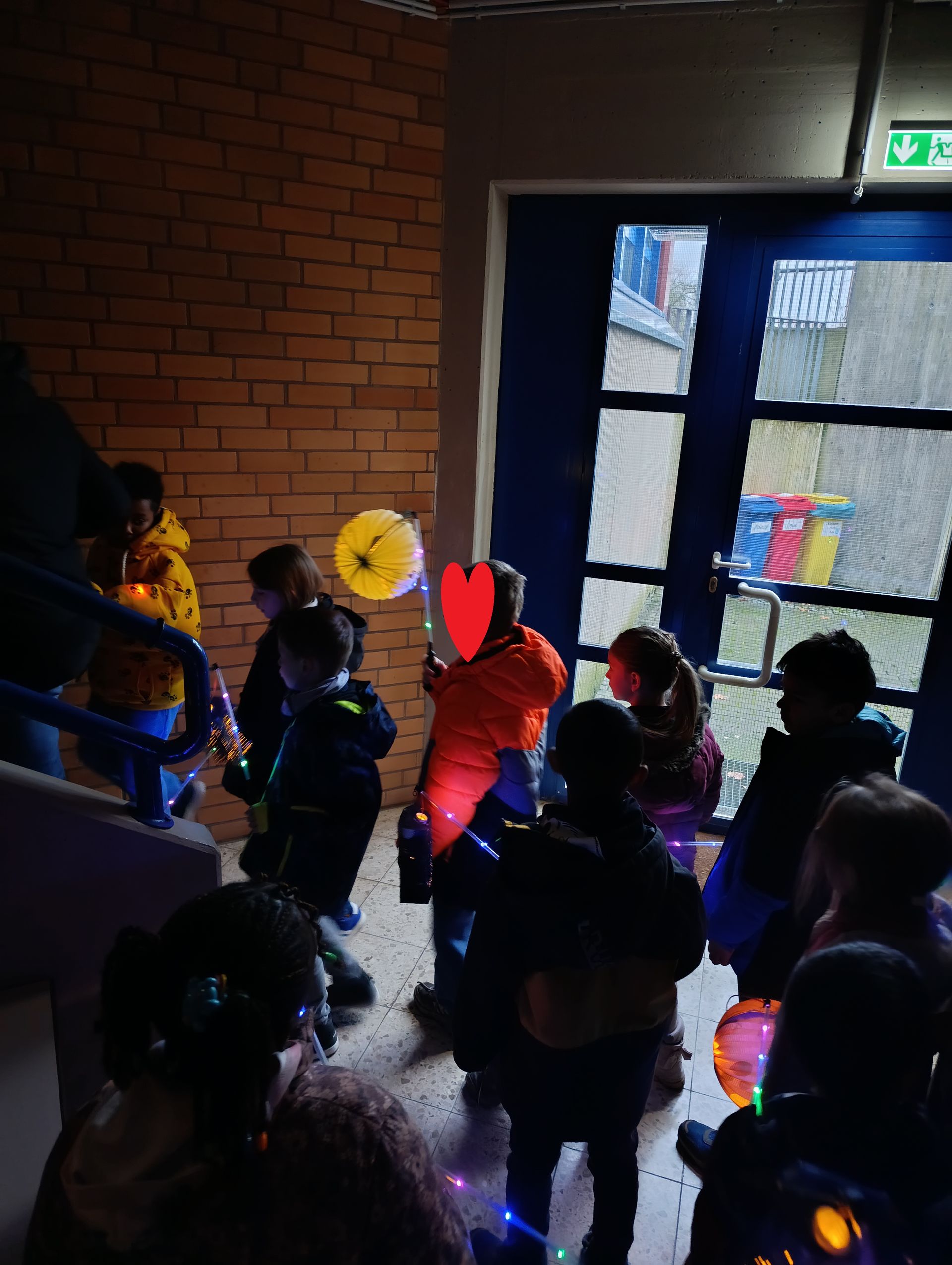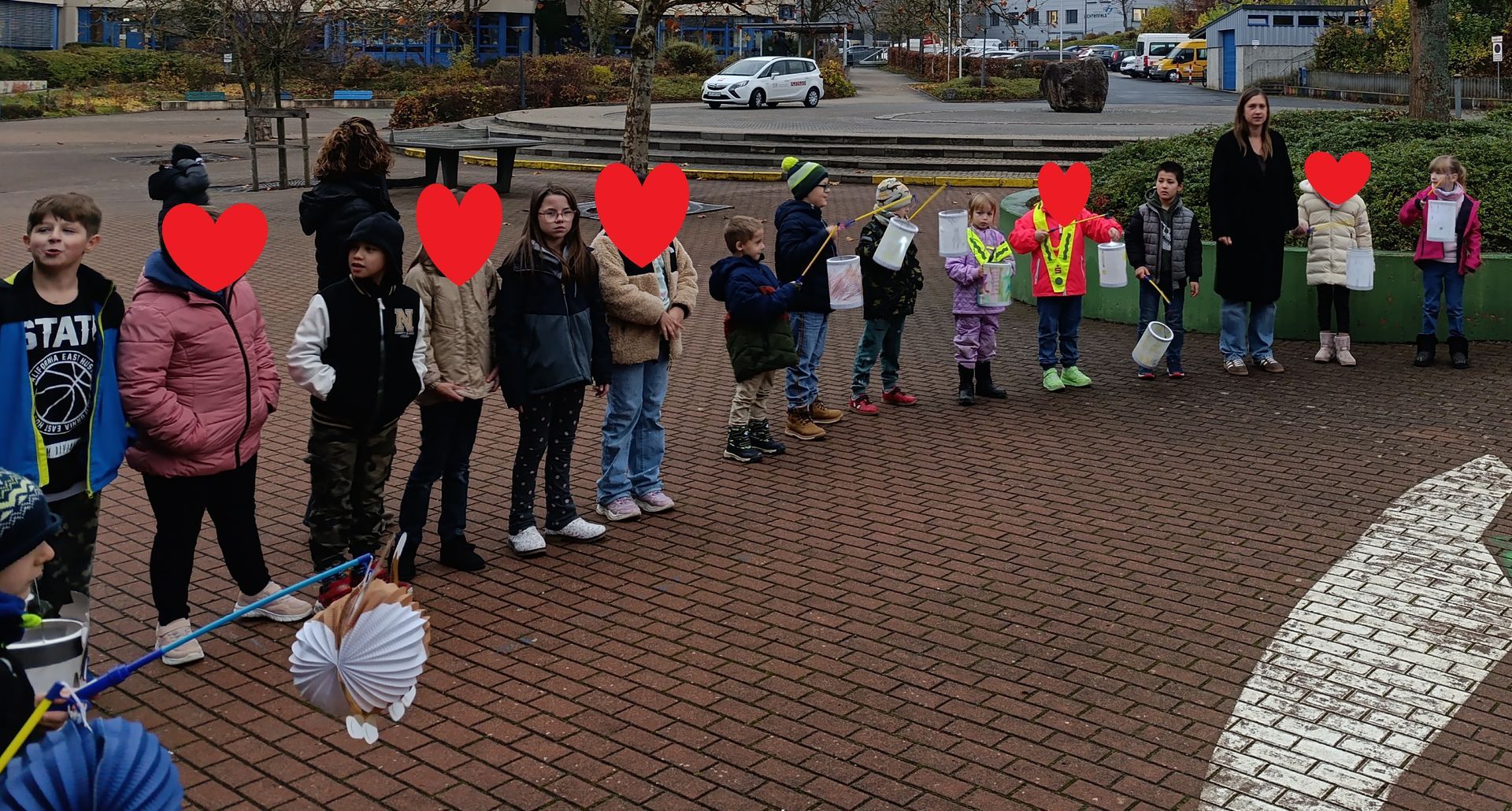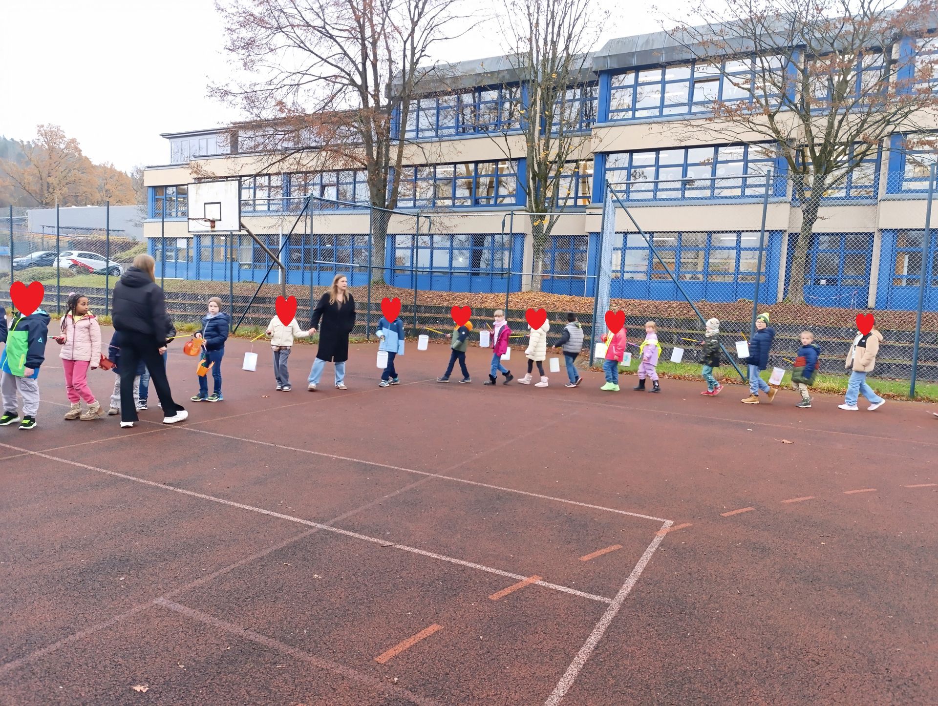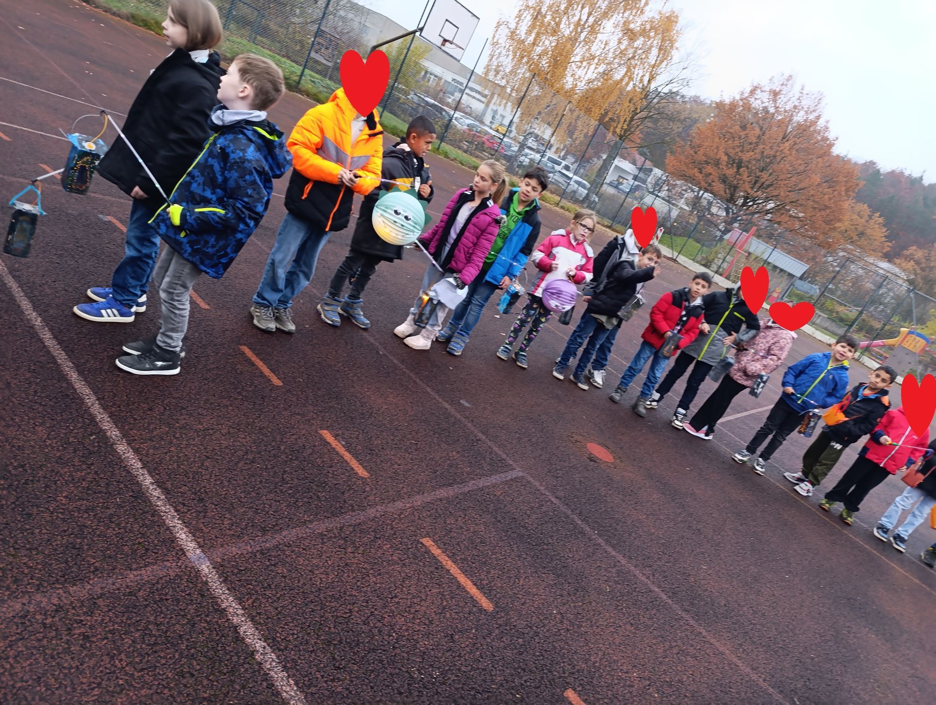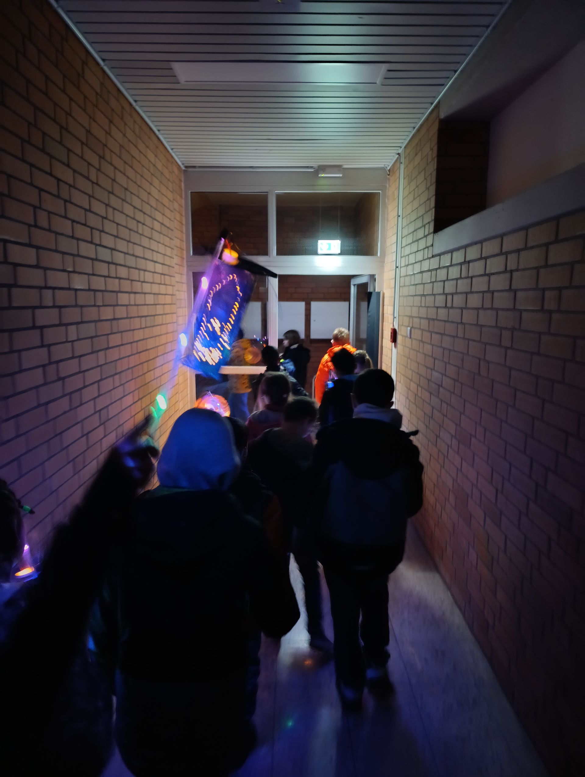 Im Pausenhof sangen wir bekannte St.-Martin-Lieder. Anschließend zogen wir gemeinsam um das Schulgebäude, bildeten auf dem Hartplatz hinter der Schule einen Kreis und sangen weitere Lieder. Danach liefen wir mit unseren bunten Laternen durch das Schulhaus und erlebten die festliche Stimmung.