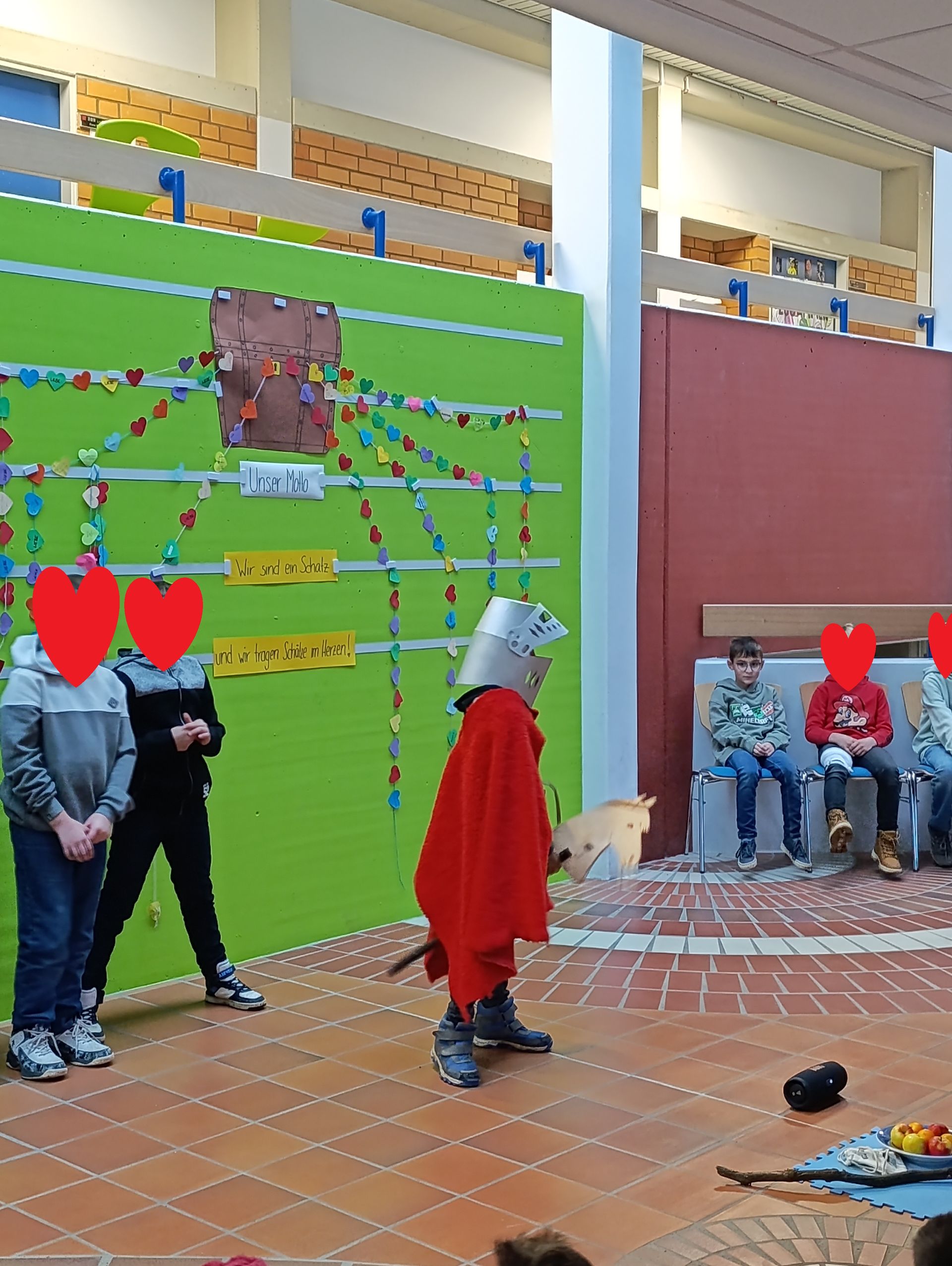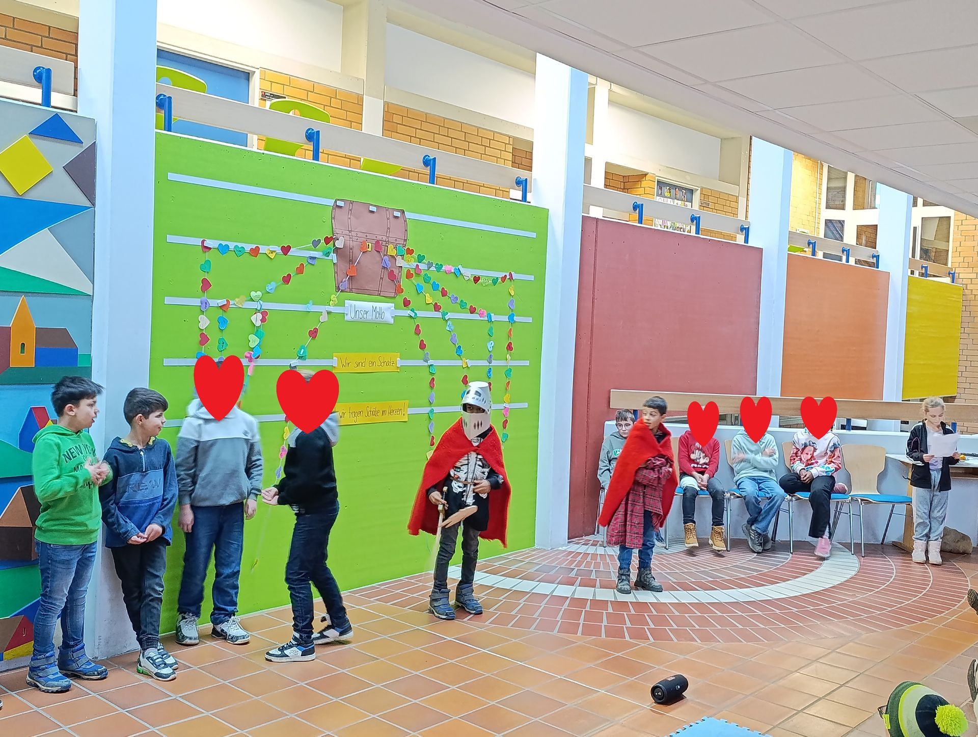 Zum Abschluss trafen wir uns alle in der Aula. Die Klasse D2 führte das St.-Martin-Spiel auf und zeigte uns eine eindrucksvolle Darbietung. Danach ging es zurück in unsere Klassenzimmer, wo wir leckere Martinsbrezeln erhielten — immer zwei Kinder zusammen, so wie St. Martin teilten auch wir unsere Brezel gerne miteinander.